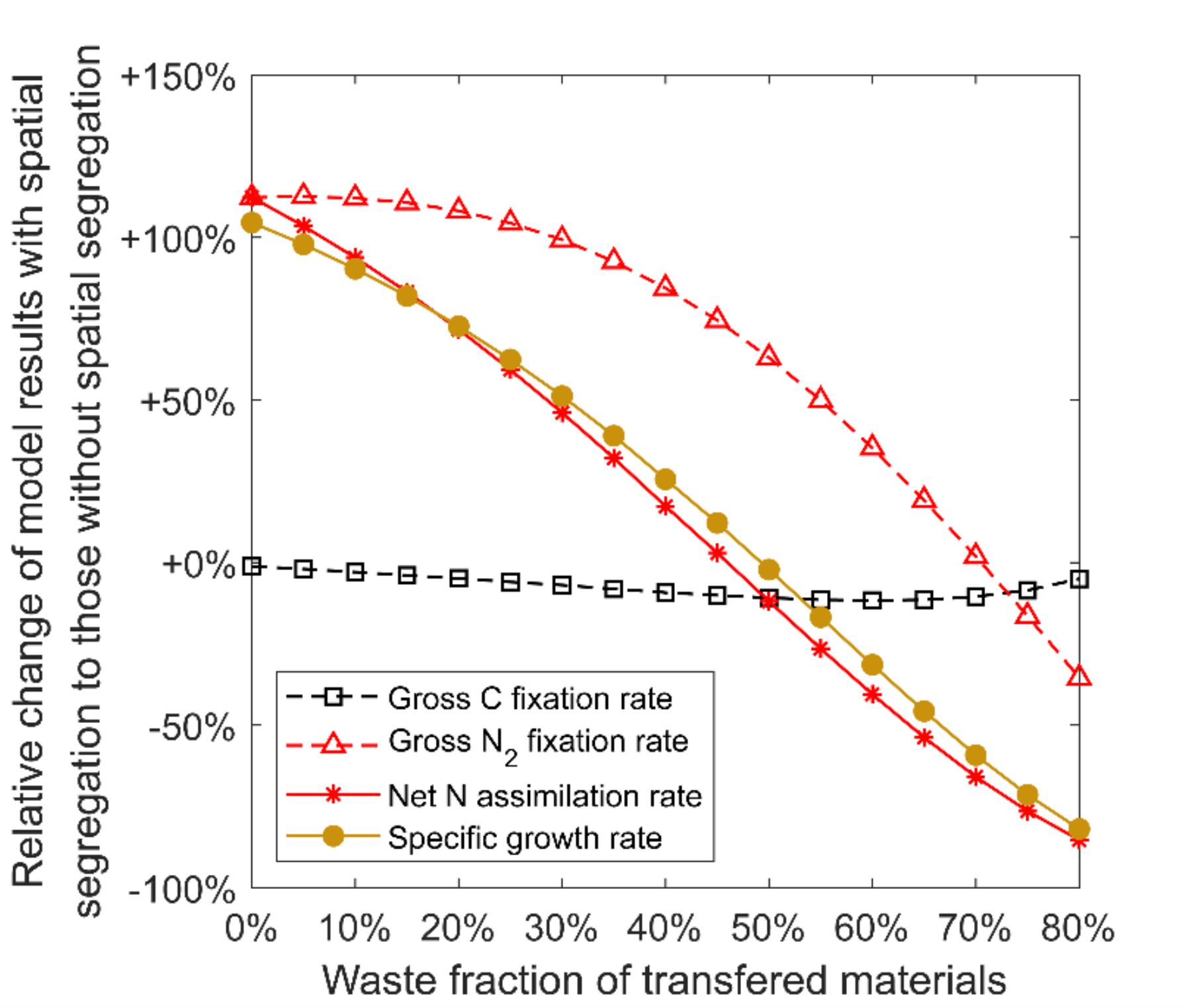 图4. 光合和固氮作用空间隔离下,模型实验中束毛藻固氮和生长速率与物质转运损耗比例的关系