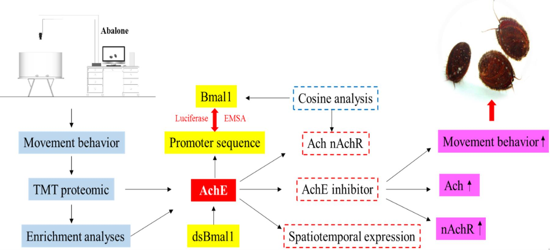柯才焕教授团队通过视频记录、行为参数定量等方法,并借助蛋白质组学、双荧光素酶报告基因、凝胶迁移等技术手段,揭示了鲍核心生物钟基因Bmal1介导胆碱能系统参与了鲍昼夜行为节律的调控。对昼夜间乙酰胆碱(Ach)浓度以及胆碱酯酶(AchE)、乙酰胆碱受体(nAchR)表达水平进行了测定和余弦节律分析,发现在鲍的运动高峰期Ach浓度增加而AchE的表达量降低。给鲍注射不同浓度的AchE抑制剂甲硫酸新斯的明4h后,Ach浓度以及nAchR的表达量显著升高,鲍的运动行为更加活跃,说明胆碱能系统在维持鲍节律行为过程中发挥调控作用。研究还发现核心生物钟基因Bmal1不仅在昼夜间的表达水平呈现余弦节律性,而且还可以分别结合AchE、nAchR启动子的E-box区域。敲降Bmal1基因24h后,AchE和nAchR的表达量显著下降,证明Bmal1介导胆碱能系统在鲍昼夜行为节律调控中具有重要作用。