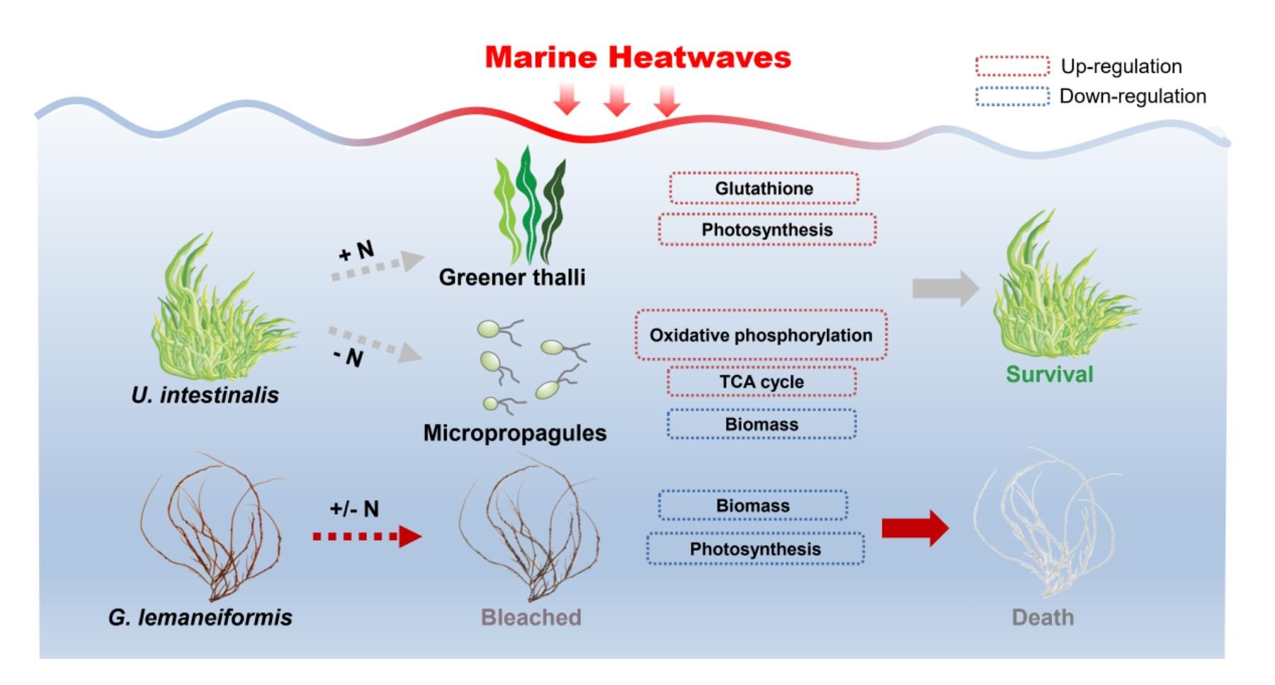 图1丨肠浒苔和龙须菜对海洋热浪和氮加富差异性响应的示意图