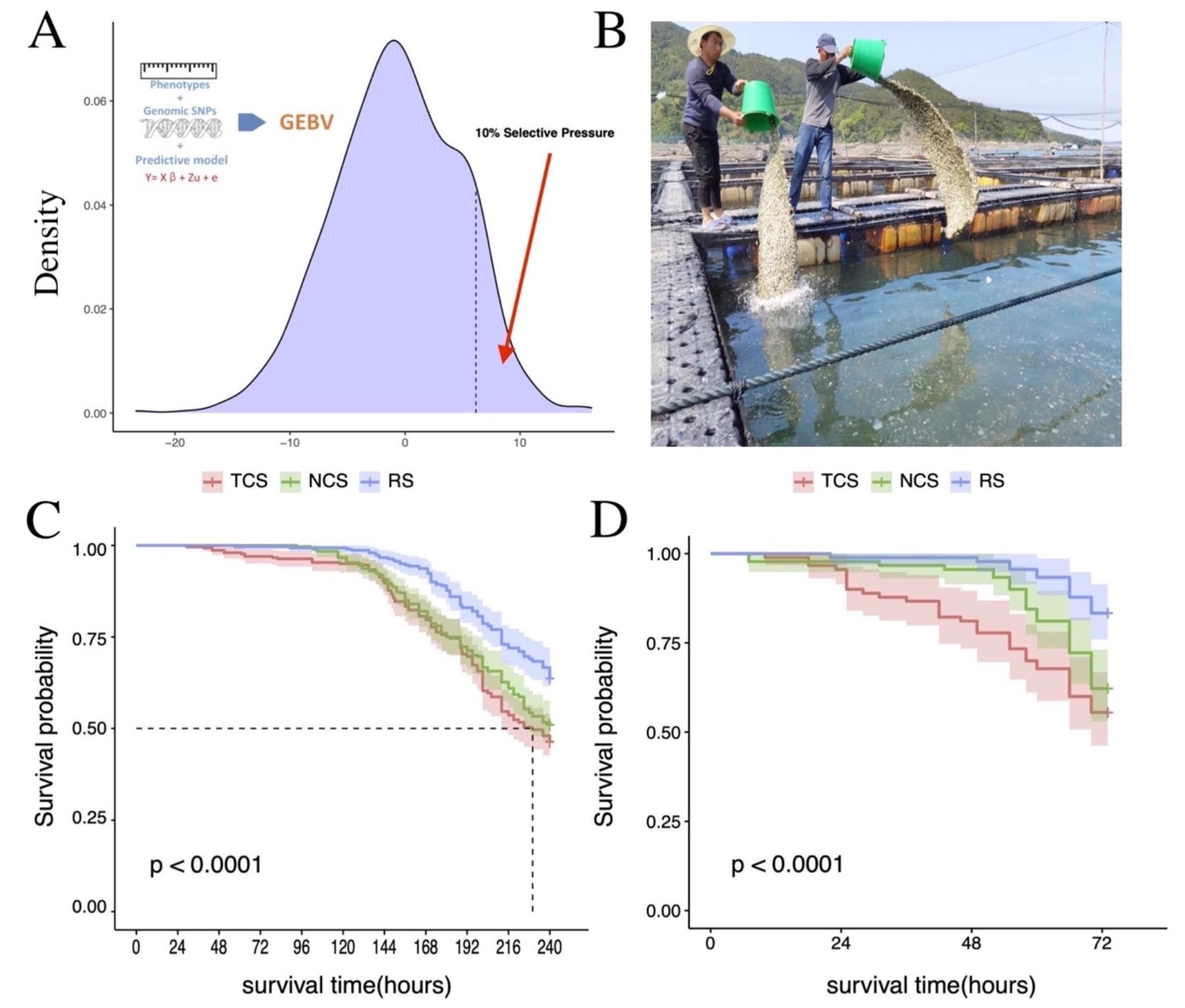 徐鹏教授团队与宁德市富发水产有限公司、福建省农业科学院开展联合育种,面向大黄鱼养殖产业的重大需求,自2018年着手开展大黄鱼抗“内脏白点病”的全基因组选择育种工作,构建了大黄鱼“内脏白点病”的人工感染体系和标准化测评体系。2020年秋季,1,163尾大黄鱼被用于“内脏白点病”感染能力测评以构建参考群体,选择其中的代表性个体607尾进行基因分型,获取每个个体的遗传信息,一共采集了46,039个高质量SNP数据用于后续的遗传分析。通过遗传参数估计,计算出大黄鱼“内脏白点病”抗性的遗传力约为0.30,同时使用多种模型进行评估,确定了大黄鱼抗“内脏白点病”性状可预测性最强的GS模型。在此基础上,对888尾候选群体大黄鱼的基因组估计育种值(GEBV)进行计算,于2021年春季获得了首批大黄鱼抗“内脏白点病”选育系后代160万尾(图1A和B)。在之后的工作中,团队进一步对该选育系后代进行了抗性测评,结果表明,抗“内脏白点病”选育系与对照组相比具有显著的抗菌性能提升(图1C和D)。