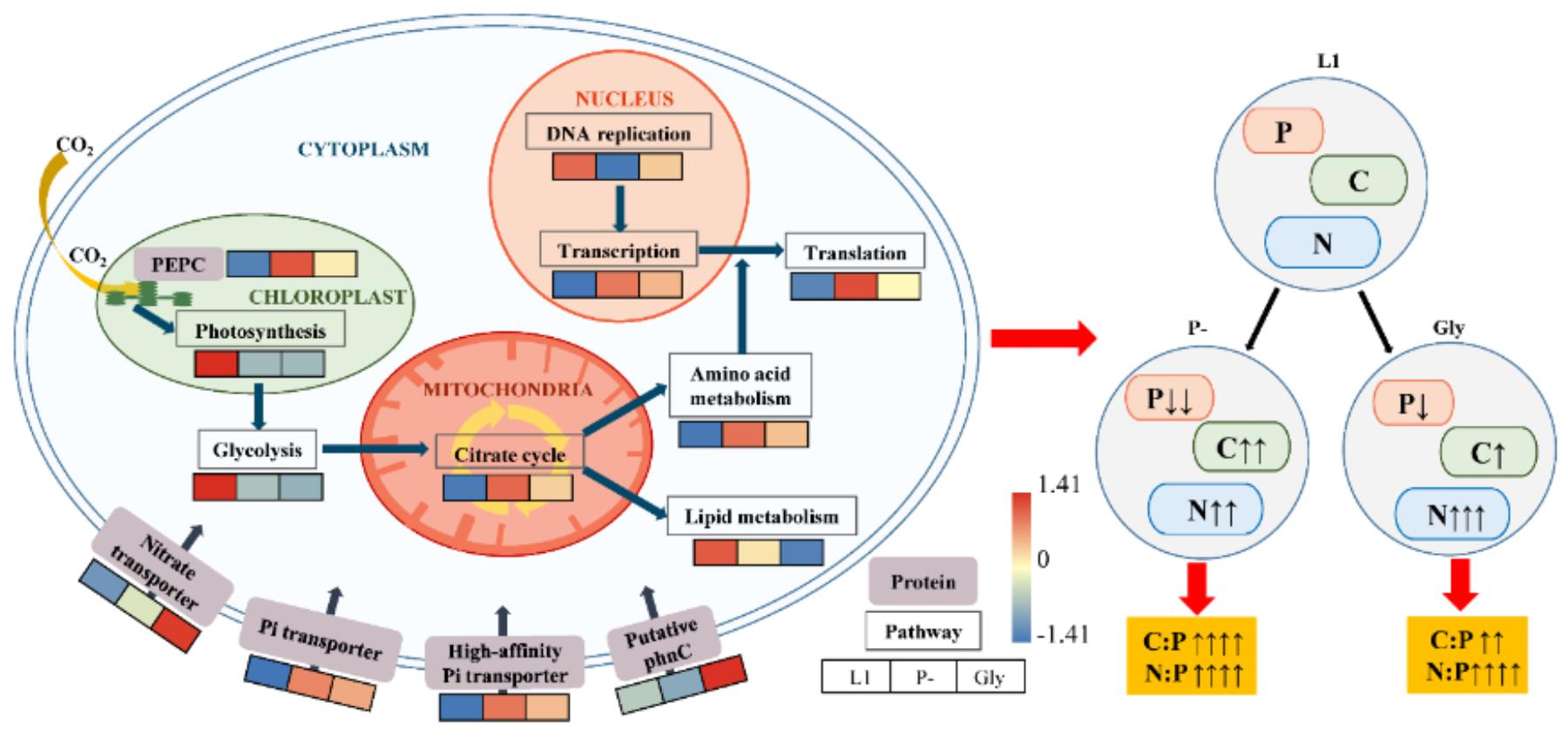 图2 颗石藻在不同磷环境中的代谢途径和特定基因的表达动态及其对细胞内碳、氮、磷含量影响的预测