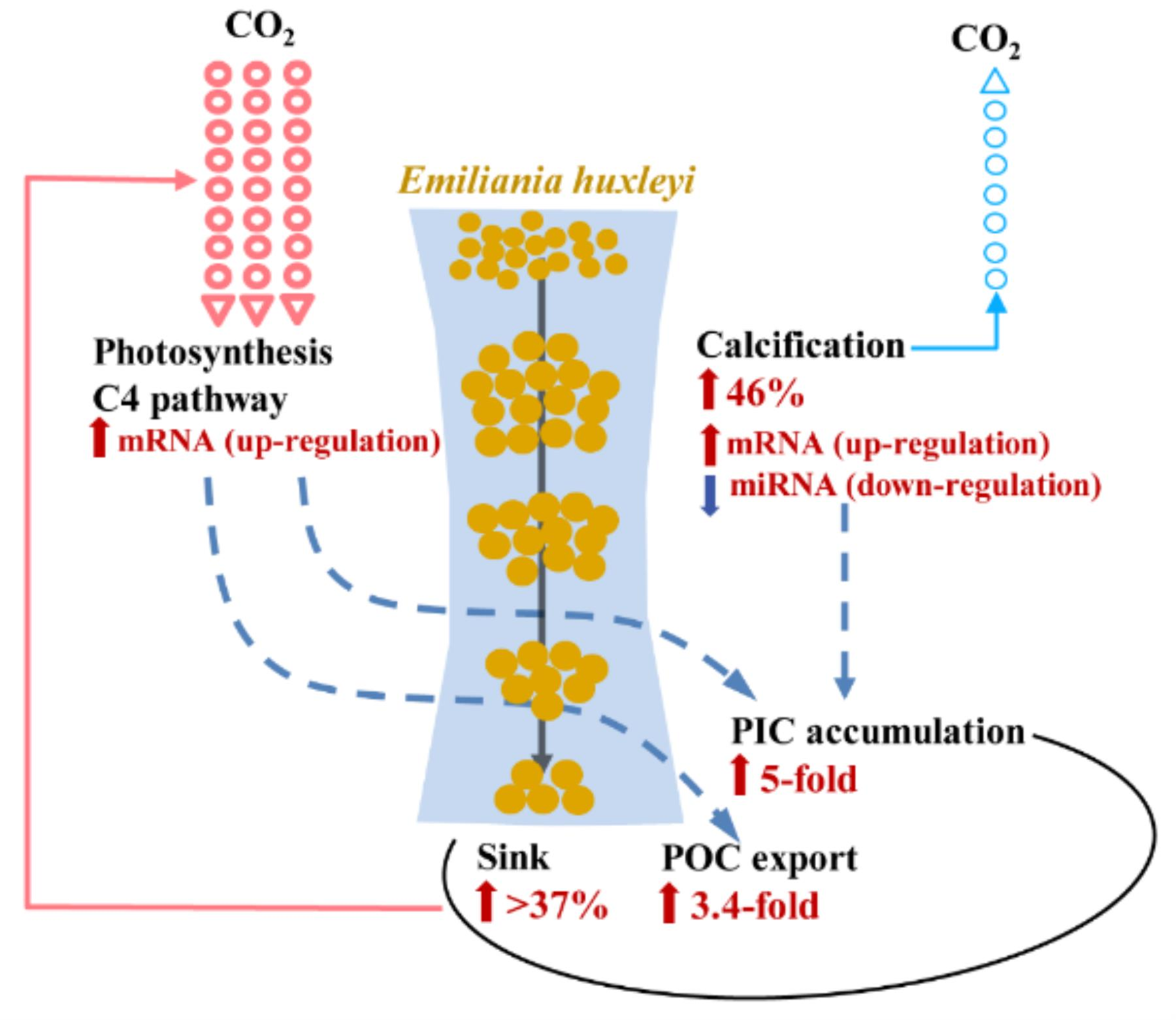 颗石藻(Emiliania huxleyi)由于外被是碳酸钙壳板,同时参与光合作用和钙化过程,是海洋生物碳泵的重要贡献者,并常常成为磷营养盐限制海域的优势种,甚至形成藻华,因此也成为研究浮游植物响应气候变化的模式种。本研究发现,在细胞转录水平和小RNA的调控作用下: