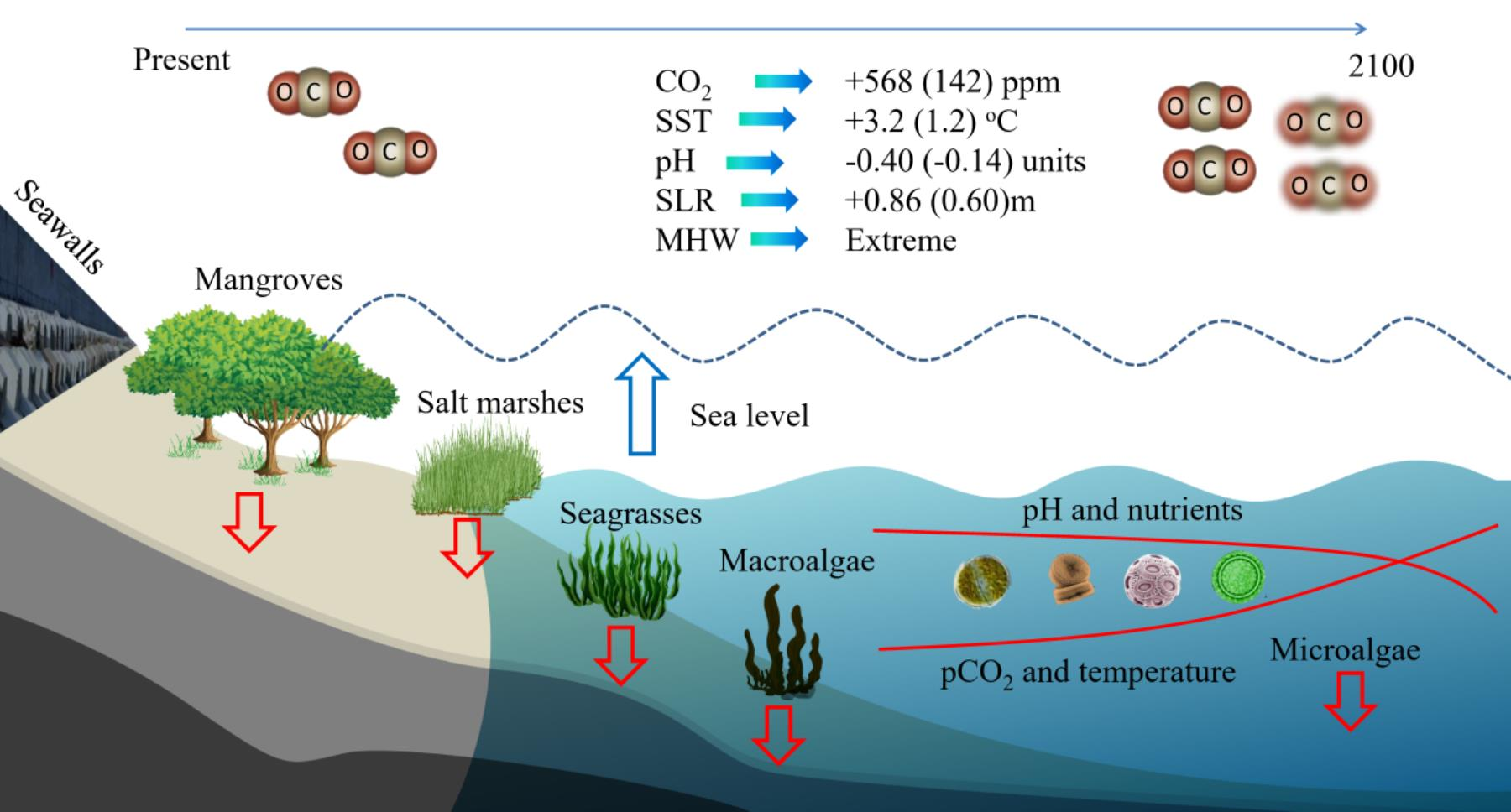图1 气候变化背景下海洋初级生产者固碳储碳能力变化。CO2、SST、 pH、 SLR等数字代表本世纪末的变化量(括号内外分别基于RCP2.6和8.5);蓝色箭头表示上升趋势,红色箭头表示下降趋势