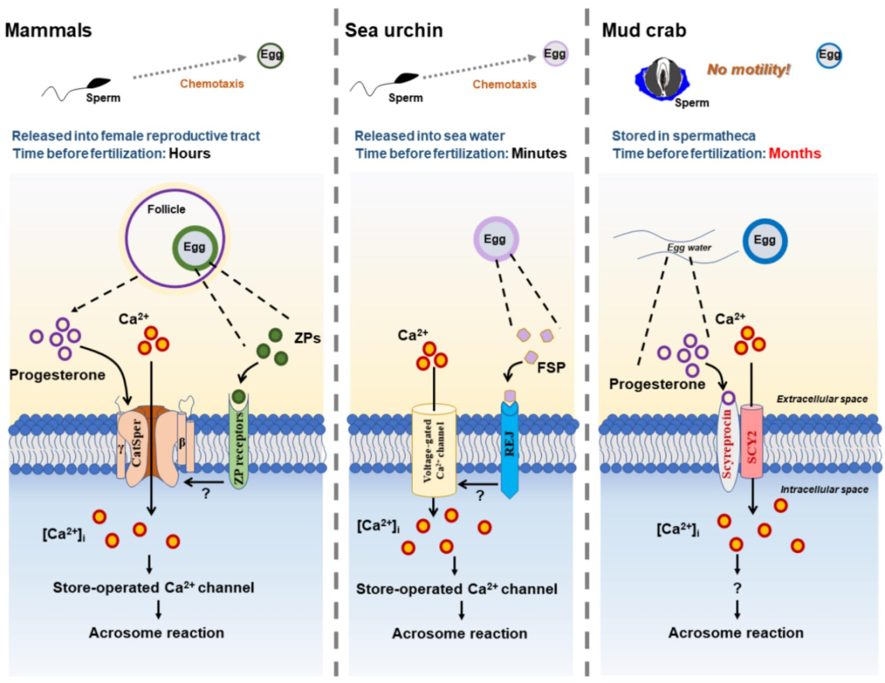 精子顶体反应是生物生殖过程中非常重要的一环,是精卵成功融合(即授精)的关键步骤。青蟹缺乏已报道的精子顶体反应相关关键因子,该项研究所揭示的青蟹精子顶体反应的分子机制,与哺乳动物以及海洋动物海胆的机制不同。通过研究发现两种抗菌肽Scyreprocin和SCY2可作为关键因子介导青蟹精子受孕酮诱导的顶体反应,该发现鲜有报道,是一种新的精子顶体反应分子机制。该研究对其他动物(如缺乏已知关键因子)的精子顶体反应机制的研究具有重要借鉴价值。