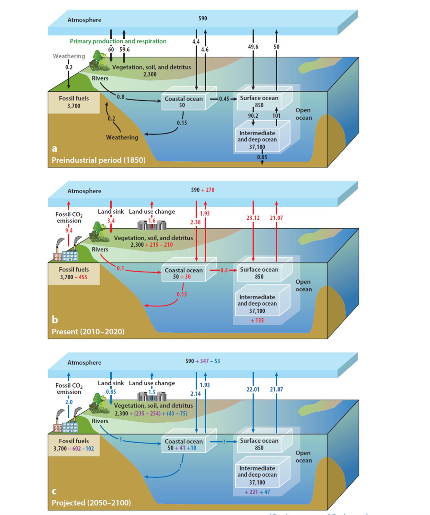 图2. 全球不同储库碳储量(箱内数字,单位:10亿吨碳)及不同储库间碳通量(箭头上数字,单位:10亿吨碳 /年)的变化 :(a)工业革命前;(b)现今。红色数字表示碳储量及碳通量较工业革命前的变化量;(c)代表性浓度路径RCP2.6情景下,2050-~2100期间。紫色和蓝色数字分别表示模式预测到2050年大气CO2浓度达到最高值时及其后开始下降的第一个50年内碳储量及碳通量较工业革命前的变化量。