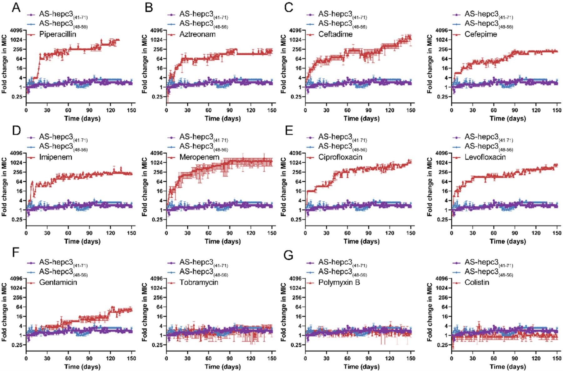 图1. AS-hepc3(41-71)和AS-hepc3(48-56)长期连续处理铜绿假单胞菌未诱导其产生耐药性(Zhu D.P, et al., 2021)