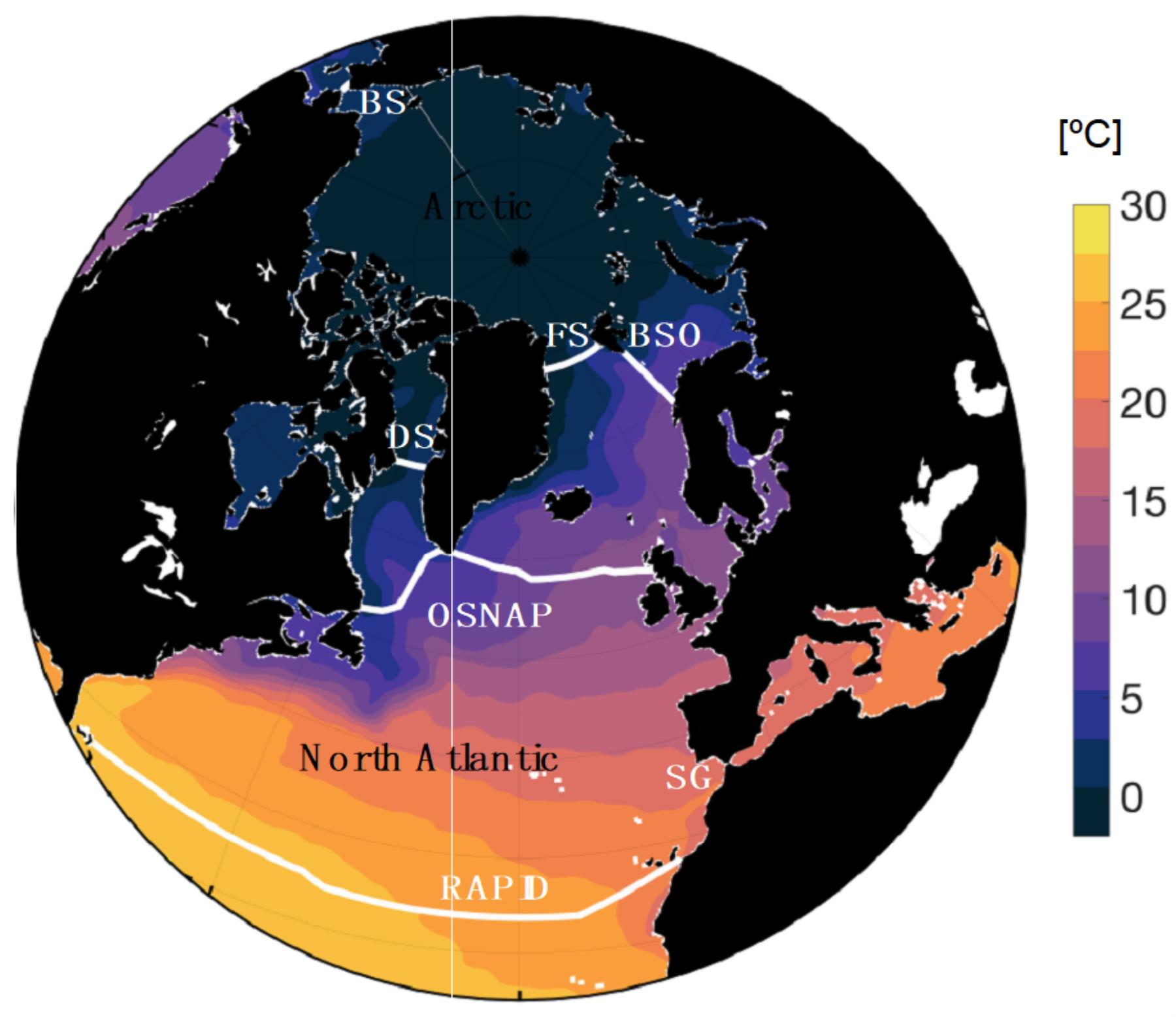 北冰洋至北大西洋区域海表温度,显示北大西洋副极地海域是北大西洋高温水团与北冰洋-亚北极的低温水团发生交互作用的关键区域。