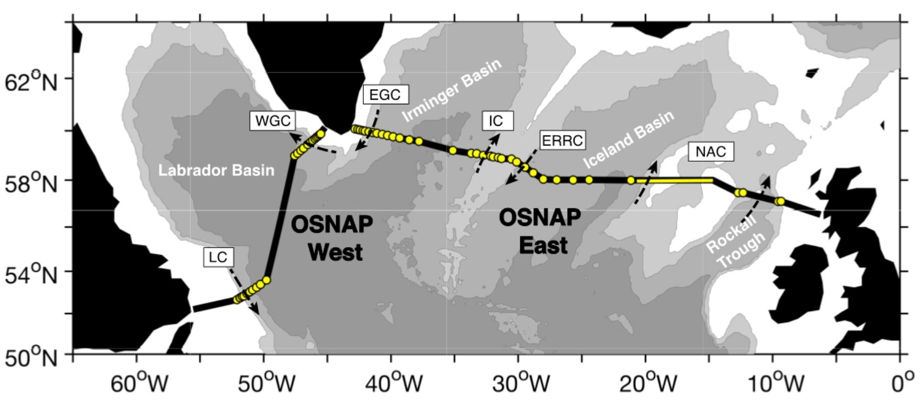 在北大西洋副极地海域布设的OSNAP潜标观测系统(黄色圆形代表潜标位置)可分为位于拉布拉多海盆的OSNAP West阵列,以及位于格陵兰岛以东副极地海域覆盖伊尔明厄海盆、冰岛海盆以及罗科尔海槽 的OSNAP East阵列。箭头代表主要的边界流系统流向——包括拉布拉多流(LC),西格陵兰流(WGC),东格陵兰流(EGC),伊尔明厄流(IC),东雷克雅内斯海岭流(ERRC),北大西洋流(NAC)。