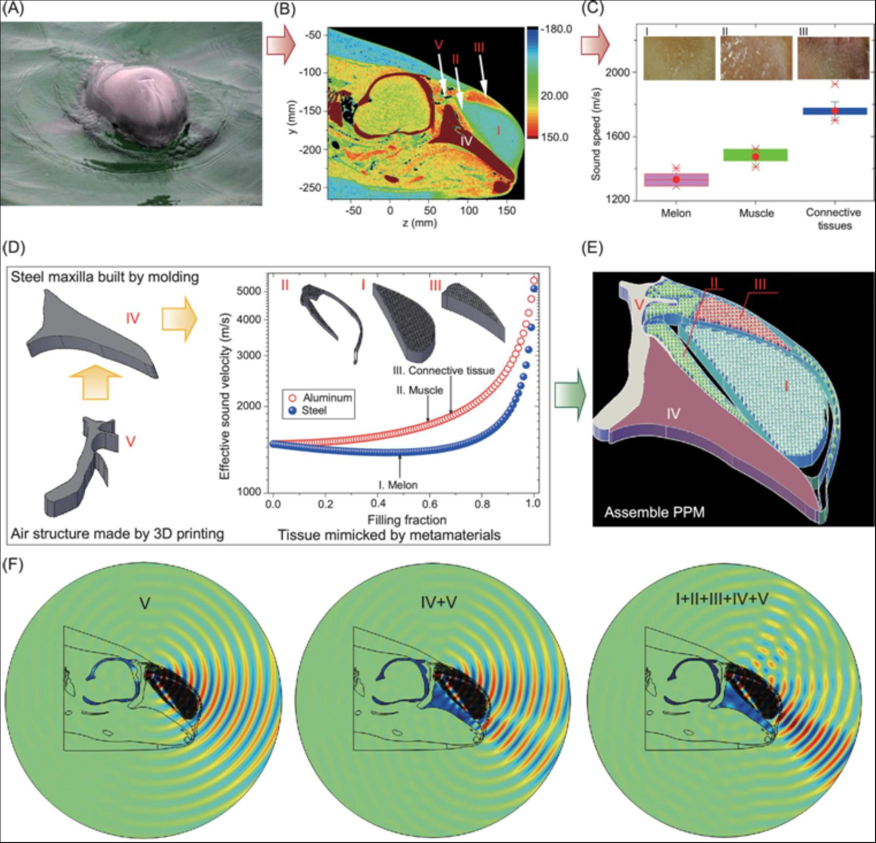 张宇教授和他的博士研究生董尔谦、美国麻省理工学院(MIT)方绚莱教授等近期在这方面取得突破性进展,提出用人工复合超材料来重构江豚声学结构。该人工结构通过气囊、头骨和变声速额隆等多相复杂介质来调控声波束(其中涉及气囊的声散射与反射、头骨-软组织的声固耦合与模式转化、声梯度组织材料的相位控制等),可以利用声波作用,在目标上产生镜像回波与弹性回波,从而实现了与江豚声呐极其相似的指向性瞬态声发射和目标探测功能。