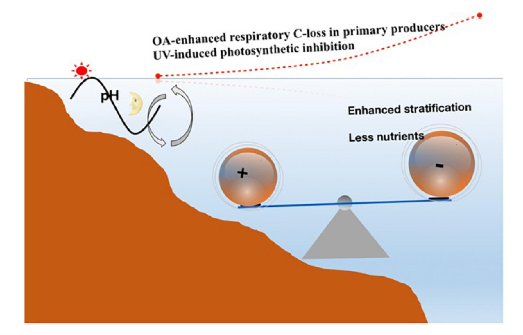 在不同海域、不同物种或不同的实验设计中,酸化、营养盐、UV与升温等因子相互作用,可协同、抵消、或拮抗性地影响初级生产过程。对钙化藻类而言,酸化降低其钙含量,并与UV或升温产生协同效应,进一步降低其钙化作用;对硅藻而言,酸化的正、负效应,依赖于光强与营养盐浓度;营养盐限制或高光下,抑制其生长;对固氮光合生物而言,酸化或增加或降低其固氮能力,就多重环境压力下的复合效应而言,尚存在较大不确定性。而大型海藻,耐受酸化能力较强,其生长受CO2浓度升高的促进。低氧化对初级生产者的影响,鲜有报道;理论预测,低氧化与酸化,会影响细胞内CO2与O2的比率,进而影响核酮糖-1,5-二磷酸羧化酶催化的羧化与氧化作用,左右浮游植物净固碳量。