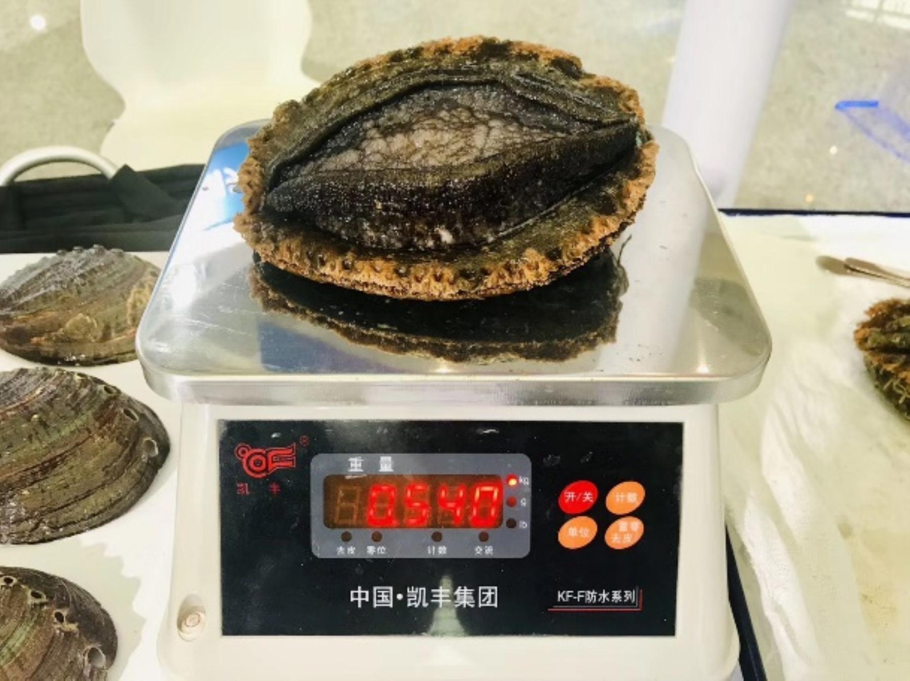 图2 展会上的单只重540克的国产大鲍鱼绿盘鲍