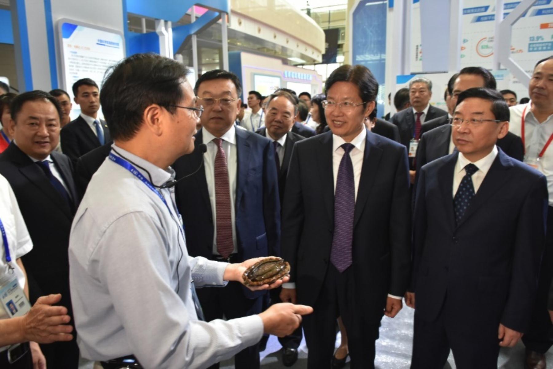 近日,第十七届中国•海峡项目成果交易会(简称“6•18”)在福州海峡国际会展中心隆重举行。在本届展会上,海洋与地球学院柯才焕教授团队带来的“绿盘鲍”新品种作为代表性成果在首次设立的科技特派员展区进行推介,引起各界极大的关注。6月18日上午,全国政协副主席高云龙、福建省委书记于伟国、省长唐登杰等领导在开幕式后进行了巡展,首站即来到绿盘鲍展位视察了解,柯才焕教授向领导们介绍了福建省鲍鱼养殖现状及“绿盘鲍”新品种的产业化推广应用情况,并逐一回答了他们的问题。