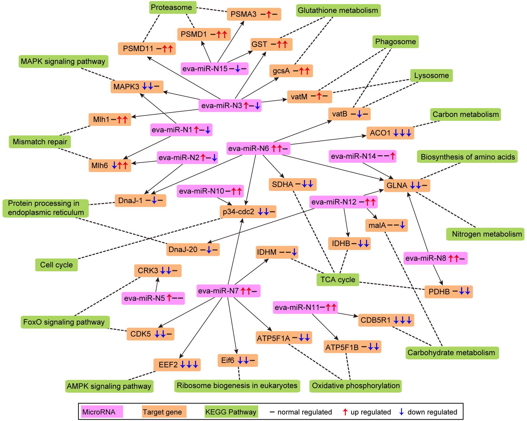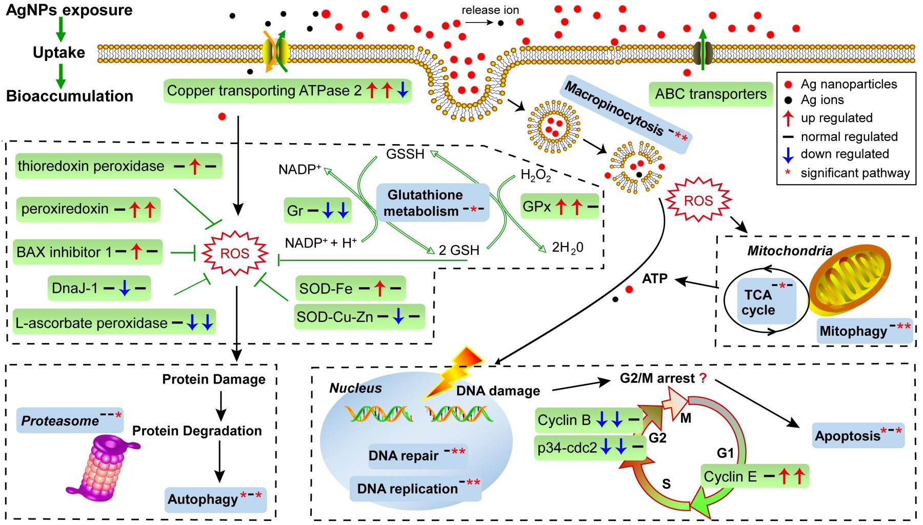 该研究发现,扇形游仆虫通过内吞作用途径摄入纳米银颗粒,并通过铜离子转运蛋白跨膜运输银离子(纳米银在培养体系中释放)。纳米银颗粒及银离子在虫体内快速累积并达到较高的浓度(暴露24小时的干重比为1.38 ± 0.15 mg/g),进而带来一系列危害,包括造成线粒体功能障碍(检测到ATP含量显著降低)、脂质过氧化(检测到MDA含量显著提高)、损失DNA完整性并造成细胞周期G2/M阻滞(相关基因的表达量显著改变)。研究还检测到,虫体内累积大量的活性氧,严重的氧化胁迫使得虫体启动应激反应,包括调节一系列抗氧化酶的活力;另一个主动防卫措施是通过ABC转运蛋白及铜离子转运蛋白排出纳米银颗粒及银离子。microRNA通过抑制或降解mRNA发挥作用,整合分析发现差异表达的microRNA靶向的mRNA参与一系列生物学过程,包括细胞周期调控,DNA修复,氧化磷酸化及柠檬酸循环等,说明扇形游仆虫协调广泛的microRNA-mRNA调控网络应对纳米银的毒性。