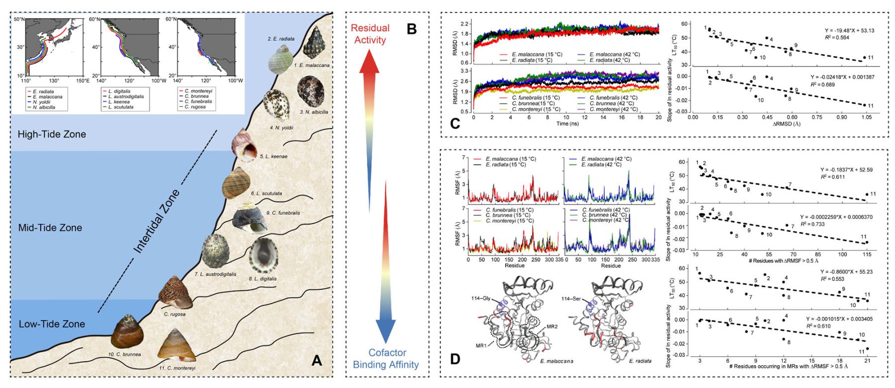 为适应不同的生境温度,酶分子需要保持稳定性(Stability)和柔性(Flexibility)之间的平衡,在一定温度范围内,既保证结构的稳定性同时维持酶的催化活性,这是生物对环境温度的长期进化适应。在高潮间带耐高温贝类中,cMDH局部柔性的增长使酶在较低的温度下能维持催化功能,并在高温条件(> 55 °C)保持结构稳定和催化功能。该研究以具有不同水平(纬度跨度达40 °)和垂直(从高潮间带到低潮间带)分布、生境原位温度跨度达60 °C的五个属12种海洋软体动物为研究对象,结合生化实验手段和计算机模拟实验方法,进一步定量测定了cMDH稳定性和柔性变化程度。研究发现,随温度升高,冷适应蛋白质稳定性和活性下降趋势更明显。蛋白质骨架原子热诱导运动程度(RMSD)与生物适应温度之间存在显著的负相关关系;当温度从15 °C升至42 °C,柔性变化(RMSF) > 0.5Å的氨基酸残基数随生物适应温度升高而降低。此外,该研究还定位了海洋软体动物cMDH温度适应性变化发生的位点/区域,指出了氨基酸序列变异位点对其的“远端效应”。