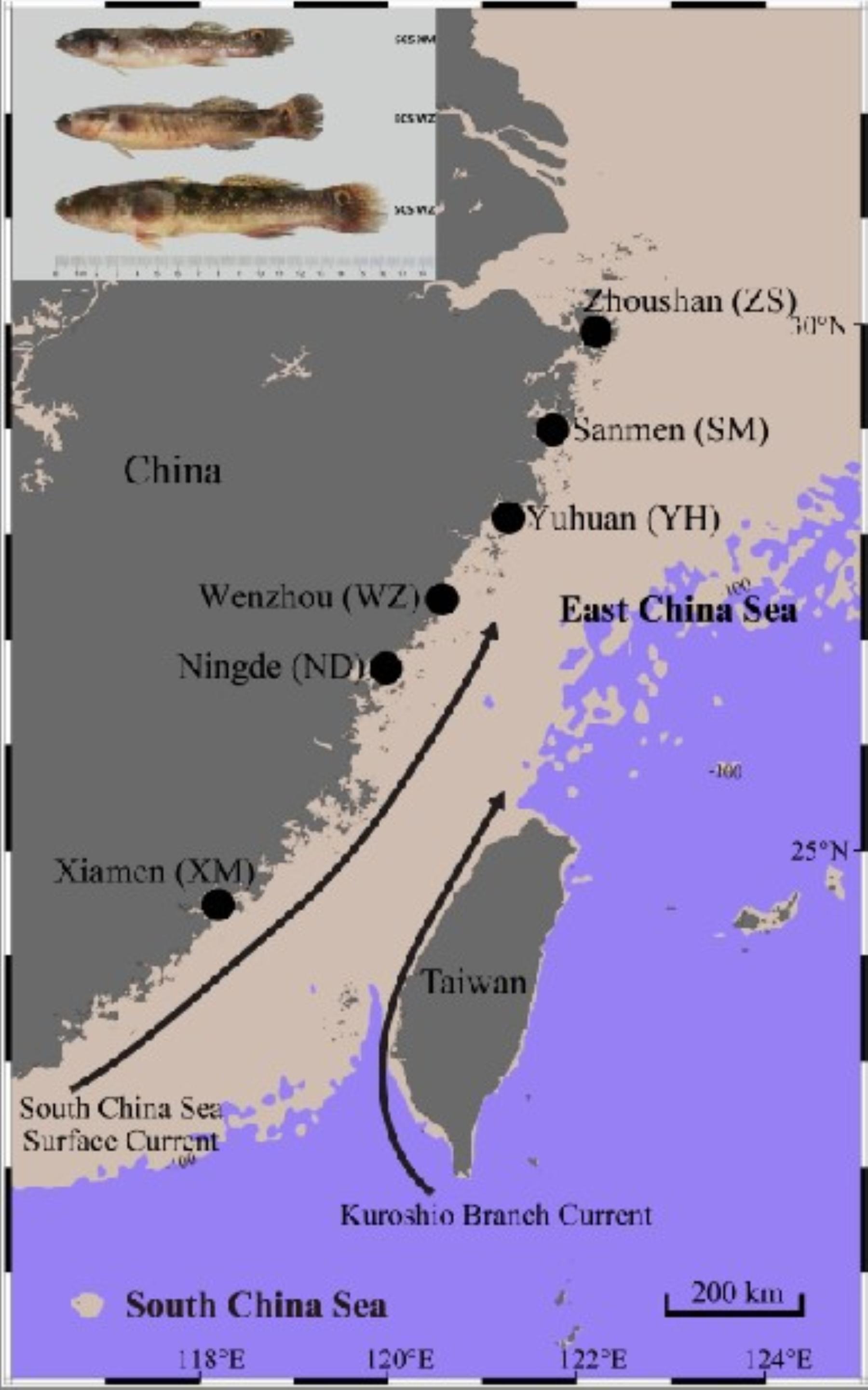 中华乌塘鳢是一种潮间带穴居鱼类,其生态繁殖习性决定了其野生地理群体间具备显著的遗传结构差异,该研究发现在我国中华乌塘鳢一个有趣的地理分布格局,原被认为只存在一个有效种的中华乌塘鳢从外部形态特征到DNA序列都存在两个分化显著的地理谱系,其中,北方谱系类群只存在于台湾海峡以北沿岸,而南方谱系类群则广布于长江口以南的沿岸海域。分子钟的推算其分歧时间大致在46-50万年前,与近百万年以来最盛的大姑冰期正好吻合。两个谱系在台湾海峡以北分布区发生二次接触,形成了典型的张力型杂交带。然而显著低于平衡值的杂交子一代数量表明谱系间存在不完全生殖隔离和正选型的性选择倾向,并具有体现繁殖策略的性状置换(character displacement)特征。这些结果都证实了华东海域的中华乌塘鳢正处于新物种形成中间阶段,是研究西北太平洋边缘海海洋生物类群杂交与种化机制的绝佳对象。