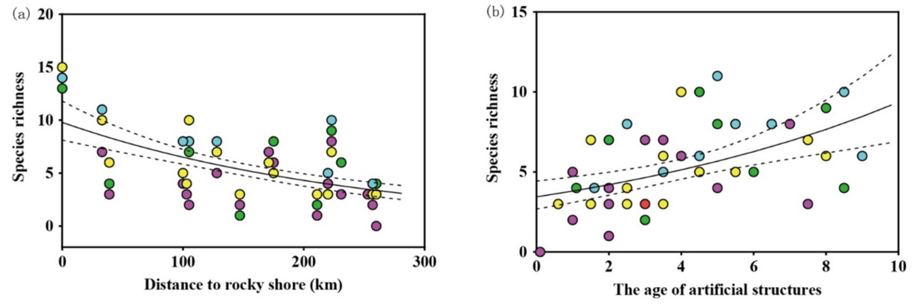 Figure 2. (a) Fitted Poisson GLM curve with 95% confidence limit between macrobenthic species richness and distances from natural rocky shores; (b) Fitted Poisson GLM curve with 95% confidence limit between macrobenthic species richness and the age of artificial structures, within 10 years; Circles with different colors represented different dates, Purple: July, 2013; Yellow: January, 2014; Green: August, 2014; Cyan: January, 2015.