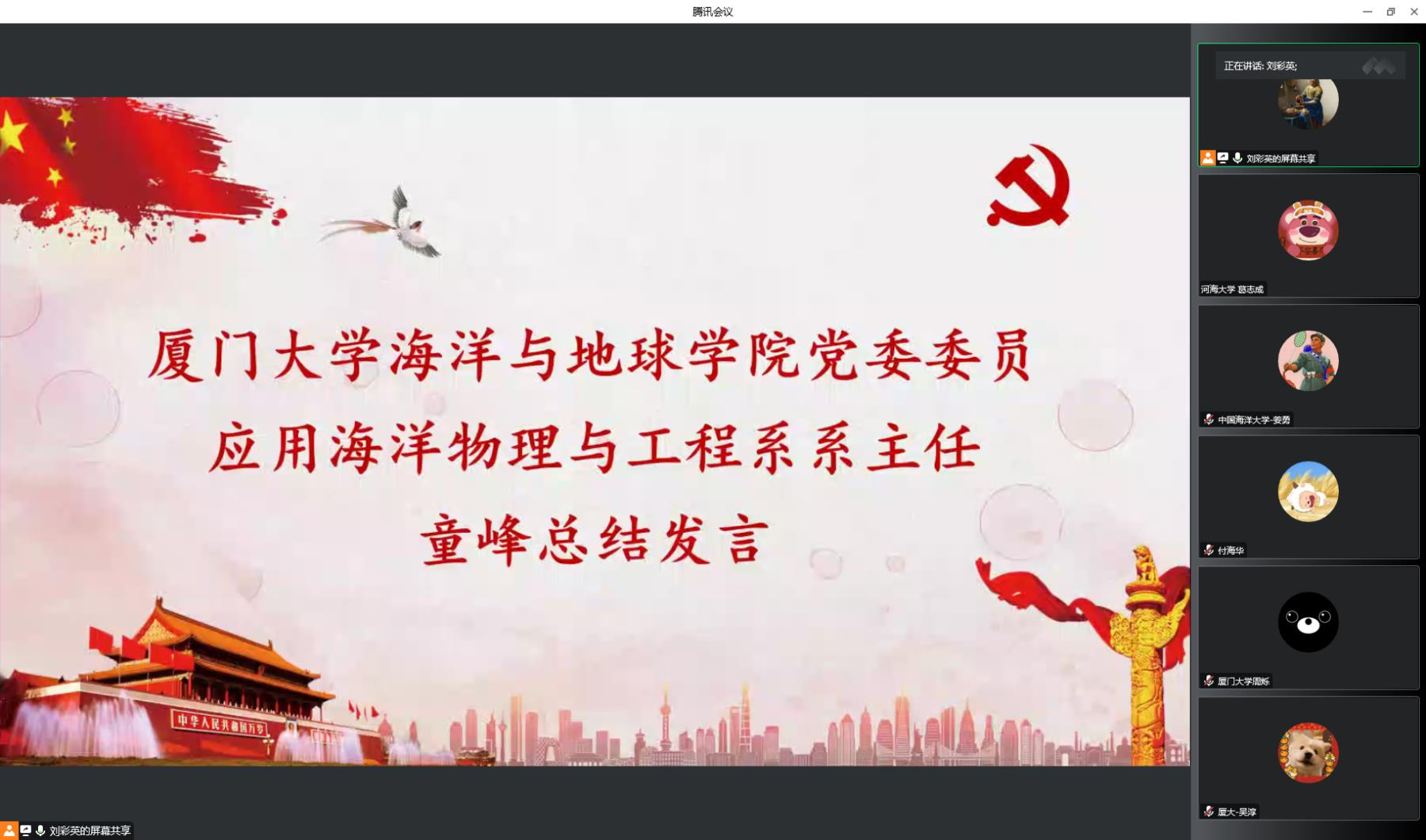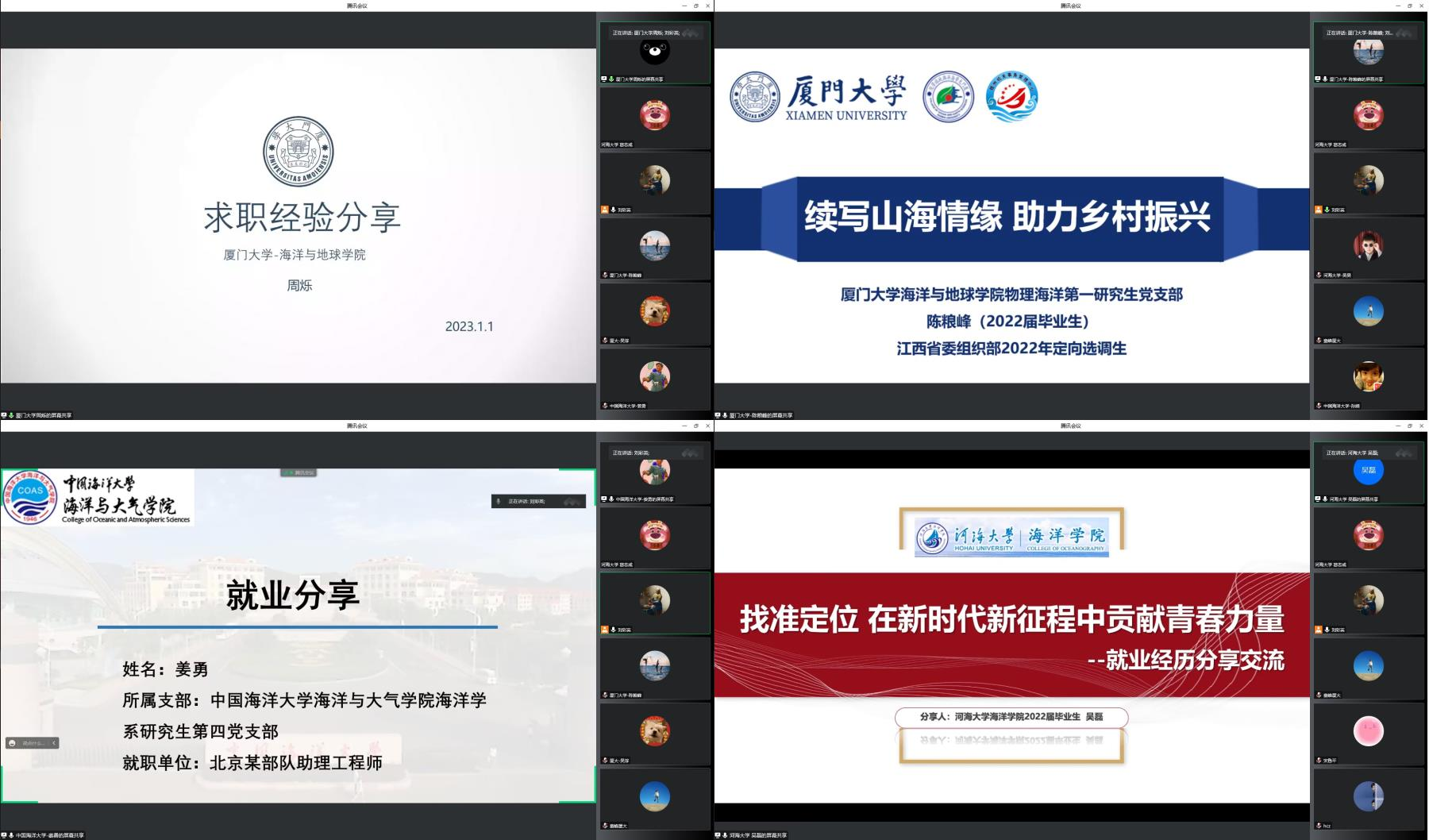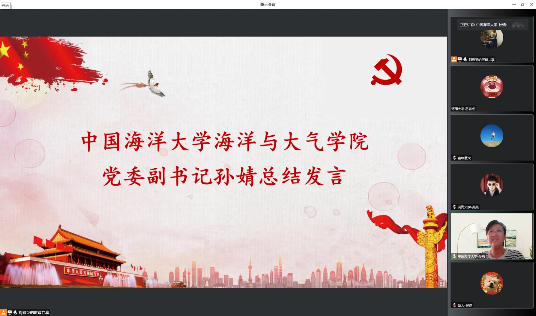 此次“云上”共建活动由我院海洋物理第一研究生党支部、河海大学海洋学院硕士党支部、中国海洋大学海洋与大气学院海洋科学学生党支部联合承办,将“就业+党建”作为联学共建的特色和亮点。海洋物理第一研究生党支部书记吴淳表示,未来,支部将进一步强化党建引领,持续开展联学共建活动,凝聚发展合力,切实提升基层党建工作实效。
