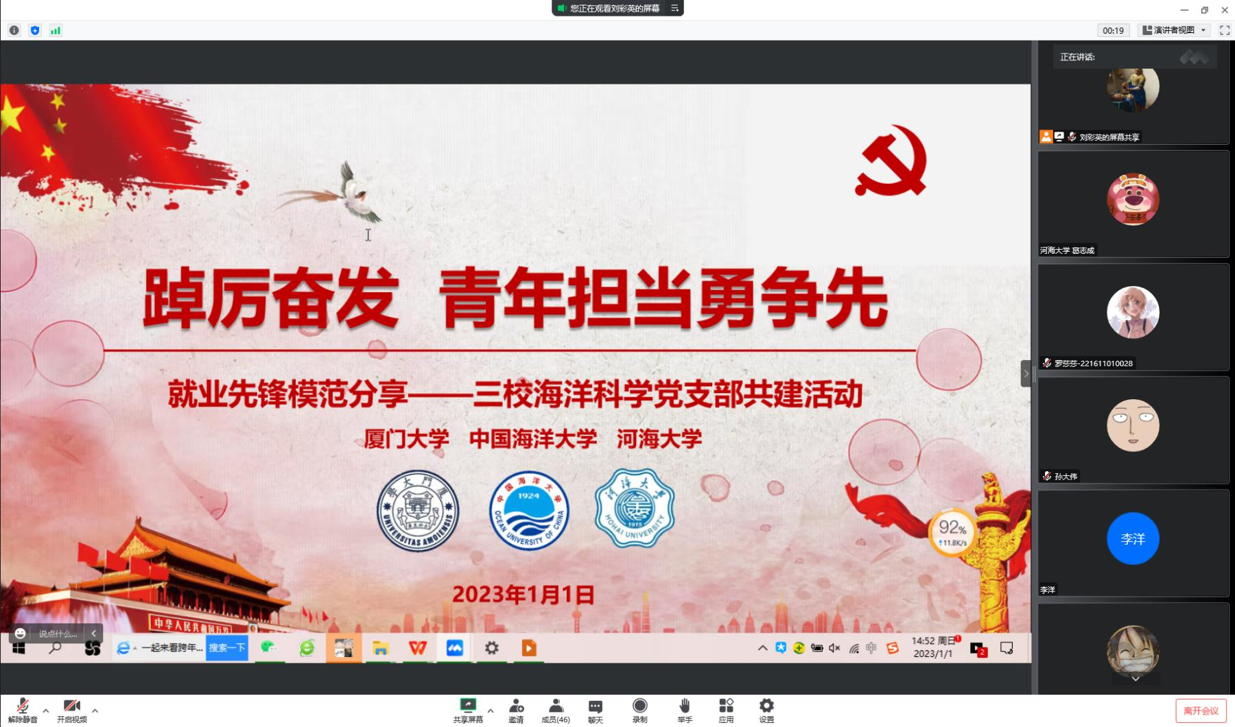 为进一步贯彻落实党的二十大精神,促进大学生高质量充分就业,2023年1月1日下午,我院与河海大学、中国海洋大学联合开展“踔厉奋发,青年担当勇争先——就业先锋模范分享”活动,三校学生党支部共计130余人参与了活动,活动通过腾讯会议开展。