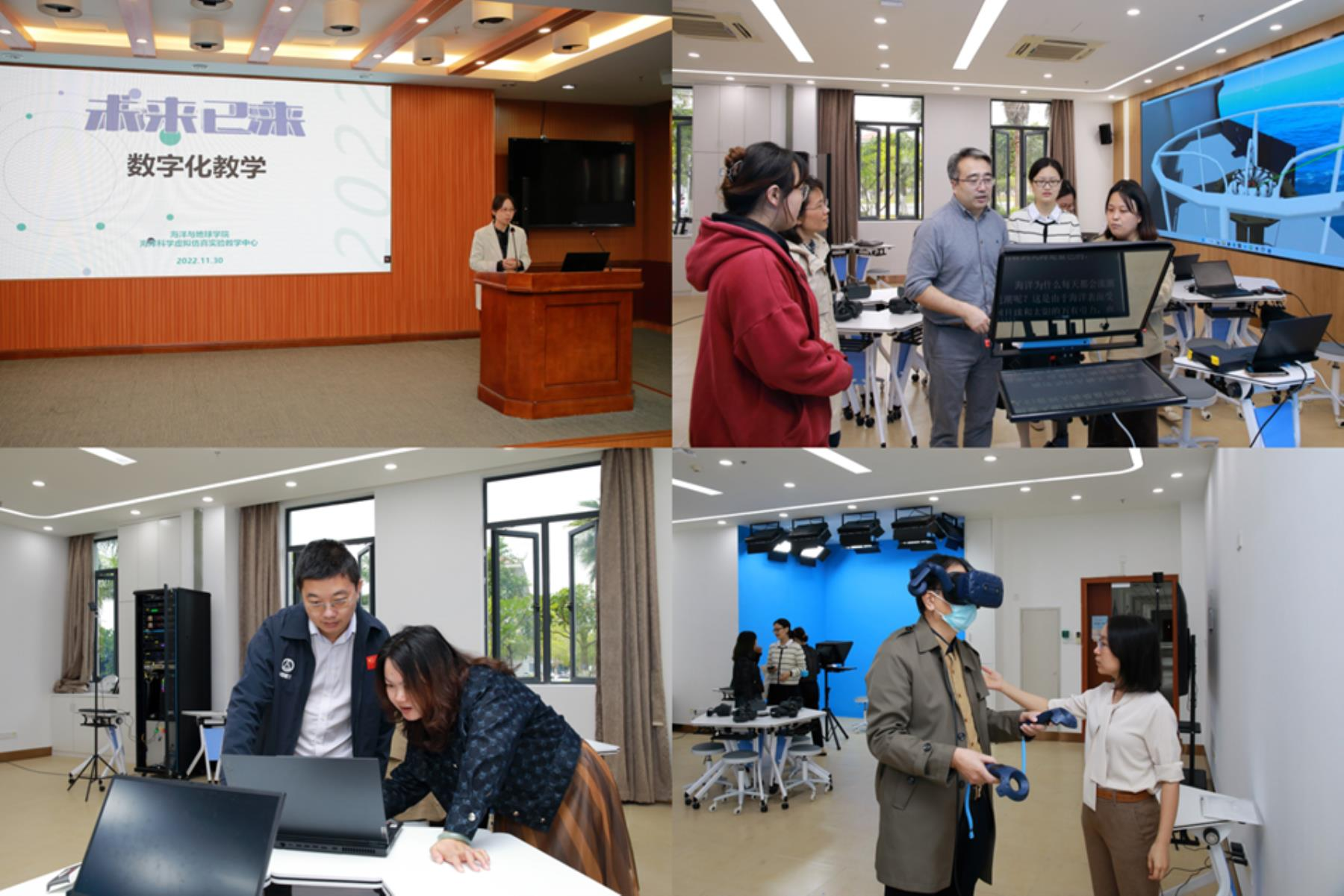 学院高级工程师方旅平代表学院海洋科学虚拟仿真实验教学中心做虚拟仿真教学改革工作进展报告。她重点介绍了中心的建设背景、人员构成、支撑平台、教学资源等内容。休会期间,老师们前往数字化教学实验室,感受新技术带来的“新体验”。
