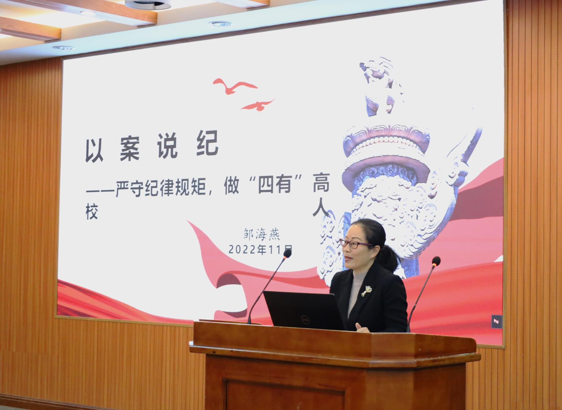 此外,为加强学院师德师风建设,大会还邀请了厦门大学纪检监察机构办公室主任邹海燕作题为“以案说纪——严守纪律规矩,做“四有”高校人”的师德师风专题报告。邹海燕以案说纪,结合具体案例,对高校易发多发的违规违纪案件进行了详细解析,以案件带来的深刻教训警示老师们要讲政治、懂规矩、守纪律、强师德,心存敬畏,行有所止。