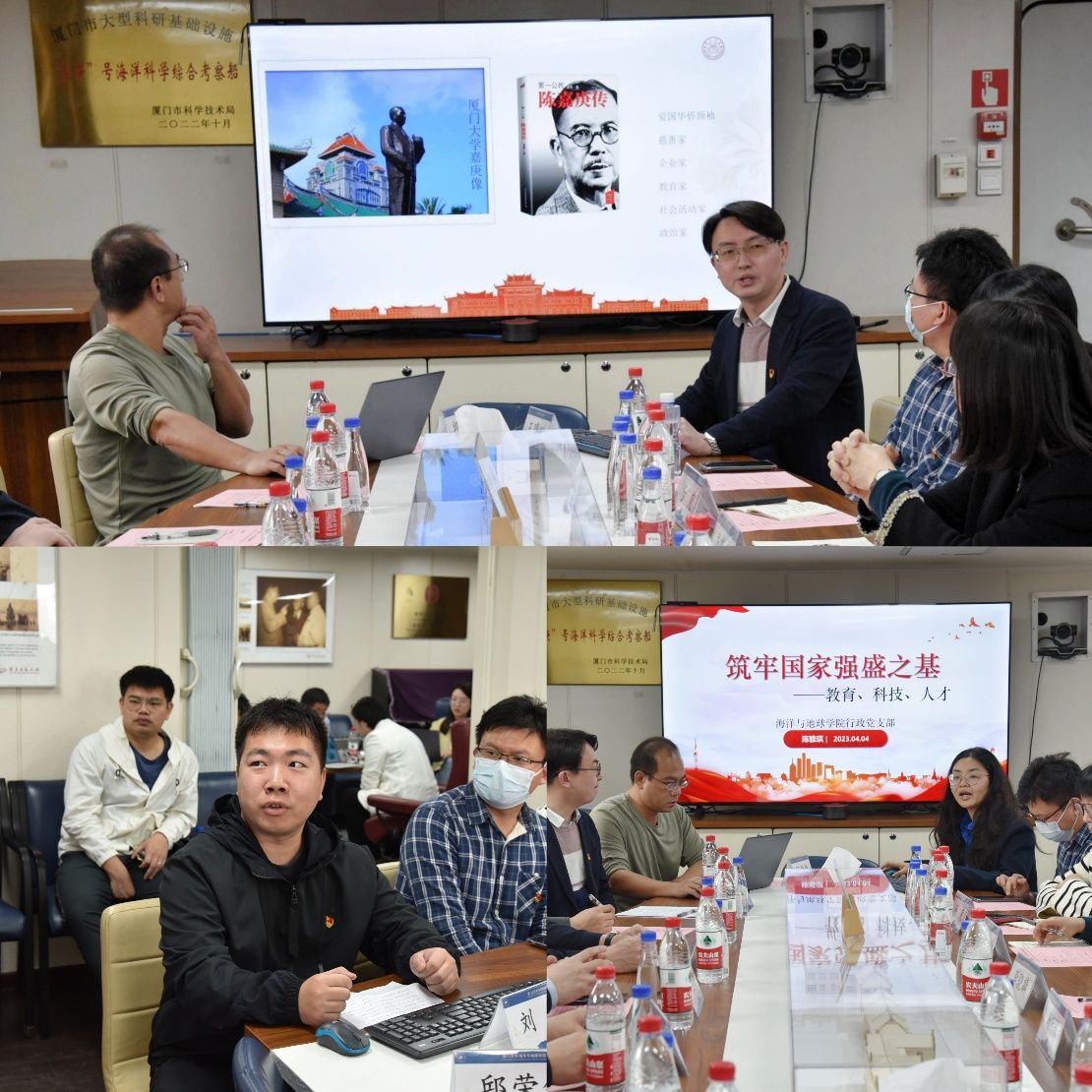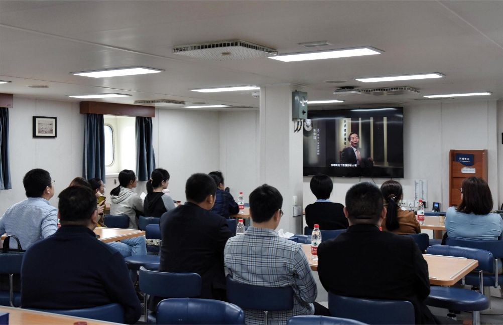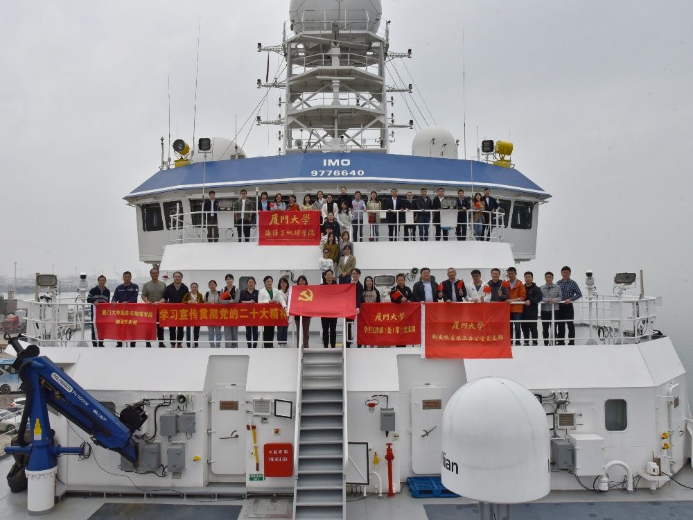 为深入学习贯彻党的二十大精神,在厦门大学建校102周年之际,4月4日上午,海洋与地球学院联合翔安校区相关单位党支部在 “嘉庚”号海洋科考船开展 “学习贯彻二十大 传承弘扬嘉庚精神”联学共建活动。翔安校区保卫办主任陶元升、学生办主任高斌、实验办主任郭志福、海洋与地球学院党委副书记邱荣锋、唐腾凤、副院长李骁麟,以及来自翔安校区办公室党支部、学生工作部(处)第三党支部、翔安校区保卫办公室党支部、翔安校区实验办、现代教育技术与实践训练办公室、图书馆和海洋与地球学院的党员干部共计50余人参加了活动。