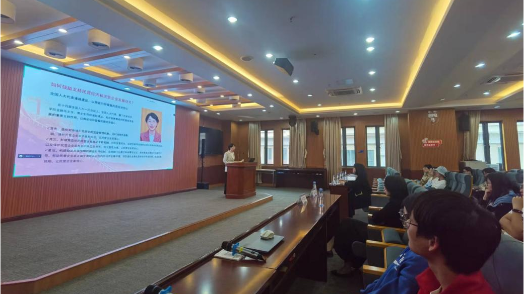潘越重点传达了大会的主要精神。她结合自己的研究领域,从经济发展的角度,以2022年及过去五年的各项指标为例,生动详实地解读了政府工作报告。过去一年,政府工作全面落实疫情要防住、经济要稳住、发展要安全的要求,实现了经济平稳运行、发展质量稳步提升、社会大局保持稳定。她指出扩大内需将是2023年经济工作主基调,有助于将我国内需潜力大、超大规模市场的优势切实发挥出来,牢牢把握发展主动权,分两步走,一是恢复,二是扩大。为鼓励支持民营经济和民营企业发展壮大,在十四届全国人大一次会议上,潘越建议,充分发挥舆论对民营经济发展的重要支持作用,以舆论引导提振民营经济信心。潘越还传达了政府工作报告里的未来生活图景,一条条惠民政策,一组组亮眼数据,彰显了党和政府以人民为中心、执政为民的理念,折射出中国经济社会发展的蓬勃生机。此外,她还对国务院计划工作报告、财政预算报告等做了详细解读,就人大常委会工作报告、“两高”工作报告、修改立法法、国务院机构改革方案、选举和决定任命国家机构组成人员等情况作了简要介绍。