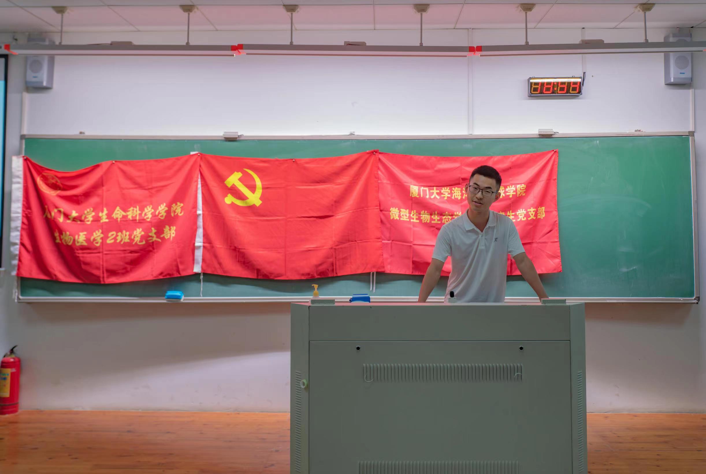 随后,微型生物生态学第二研究生党支部书记马小艺对支部成员及特色活动进行了简要介绍。支部党员徐子坤以“微碳泵引领大中和”为题进行汇报分享,带领大家深入了解“蓝碳”等生态学概念,阐述了建设海洋强国是实现中华民族伟大复兴的重要战略任务,保护海洋生态环境、实现人海和谐是海洋强国建设的内在要求。他表示,海洋负排放国际大科学计划和《宜居地球》通识课程是厦门大学建设海洋强国、研发海洋碳汇、培养海洋复合型人才的重要抓手,海洋学子要努力学习,积极开展科研,为实现碳达峰、碳中和贡献力量。