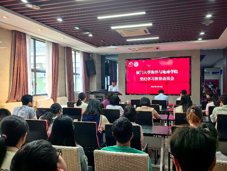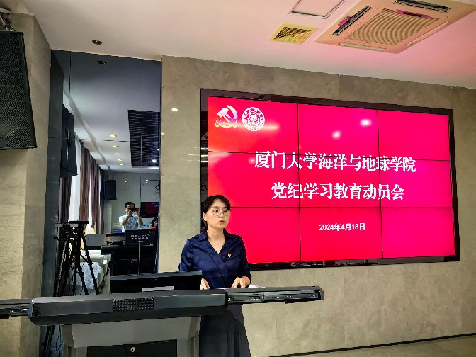 学院党委副书记、纪委书记唐腾凤传达了学校党纪学习教育动员部署会议精神,介绍了《厦门大学海洋与地球学院党纪学习教育实施方案》,并对学院开展党纪学习教育做了具体布置,明确了学院党纪学习教育目标要求、参加对象、时间安排、具体学习教育内容和落实举措。