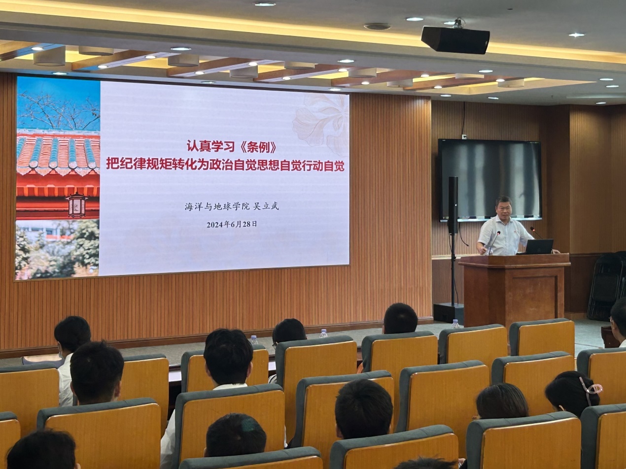 学院党委书记吴立武以《认真学习〈条例〉——把纪律规矩转化为政治自觉思想自觉行动自觉》为题,为各位党员讲授了一堂深刻的党纪学习教育专题党课。他从党的纪律建设的理论与历史逻辑讲起,指出中国共产党的纪律建设发轫于马克思主义政党学说,我们的党在各个历史时期特别是在重要历史节点高度重视并适时开展对全党的纪律教育。他认为党纪学习过程中要重点把握好纪律与法律、纪律与自由、纪律与道德等几对关系。同时,他还梳理了《中国共产党纪律处分条例》的历次修订情况,以高校几起典型的违纪案例开展警示教育,指出应以严明的纪律保障教育强国建设。他强调,纪律严明是我们党不断从胜利走向胜利的重要保障,学纪知纪是明纪守纪的前提,希望各位党员知边界、明底线,慎终如始,把纪律规矩转化为政治自觉思想自觉行动自觉,以高度的使命感、责任感投入到各项学习和工作中,加快推进“双一流”建设,为加快建设海洋强国、实现科技自立自强贡献力量。