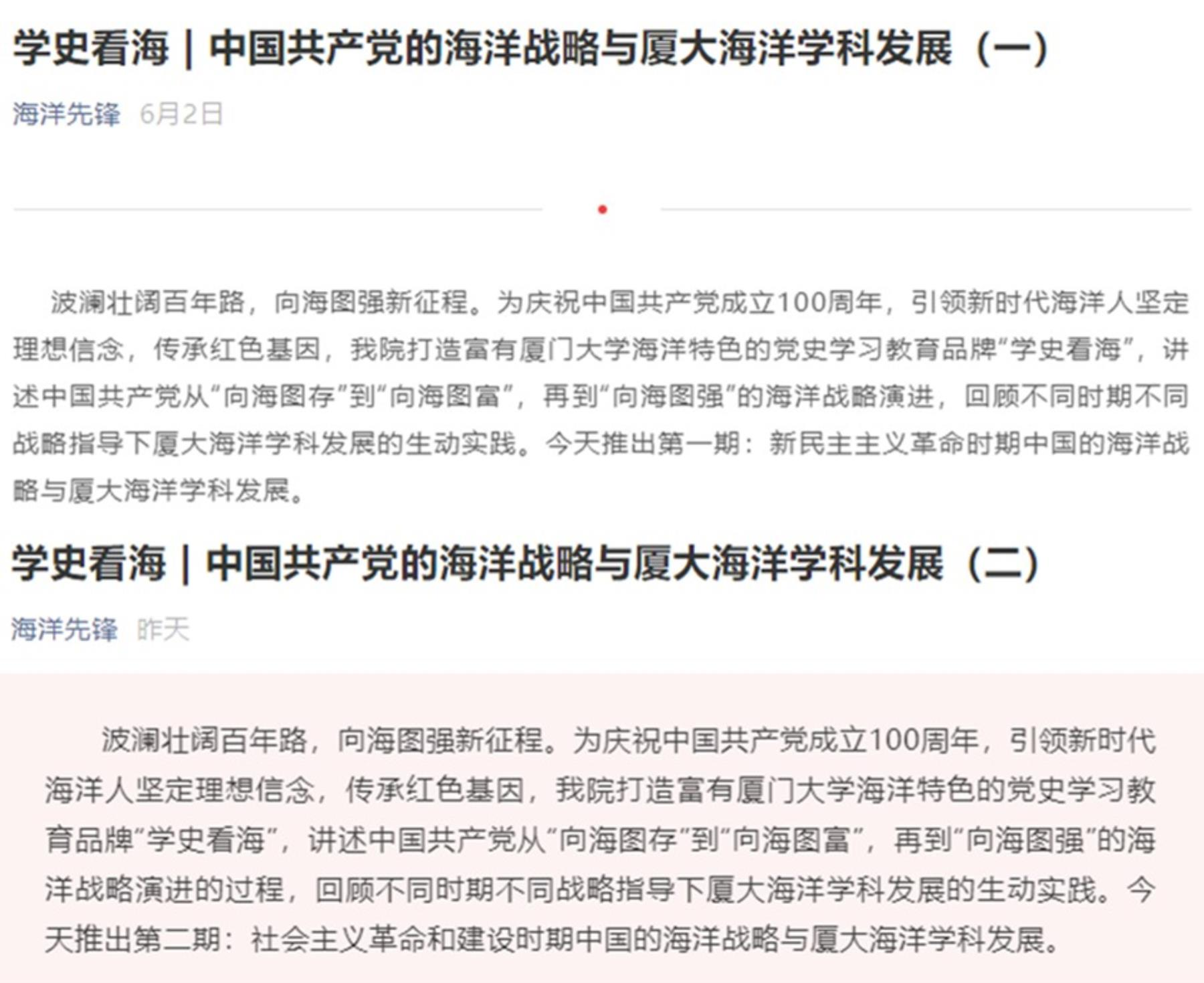 厦门大学和中国共产党同年而生,这既是历史的巧合,也是救亡图存的时代召唤。厦门大学自成立之日起即着力发展海洋科学研究,而我国第一个海洋学系则孕育自战火激发的民族需求,开启了中国近代海洋科学研究的先河,为学科一百年来的蓬勃发展奠定了坚实的基础。厦大海洋学科的发展与民族命脉紧密相连,与党的战略演进密切相关,我院依托 “海洋先锋”微信公众号,制作“学史看海”系列专题推送,讲述中国共产党从“向海图存”到“向海图富”,再到“向海图强”的海洋战略演进,回顾不同时期不同战略指导下厦大海洋学科发展的生动实践。