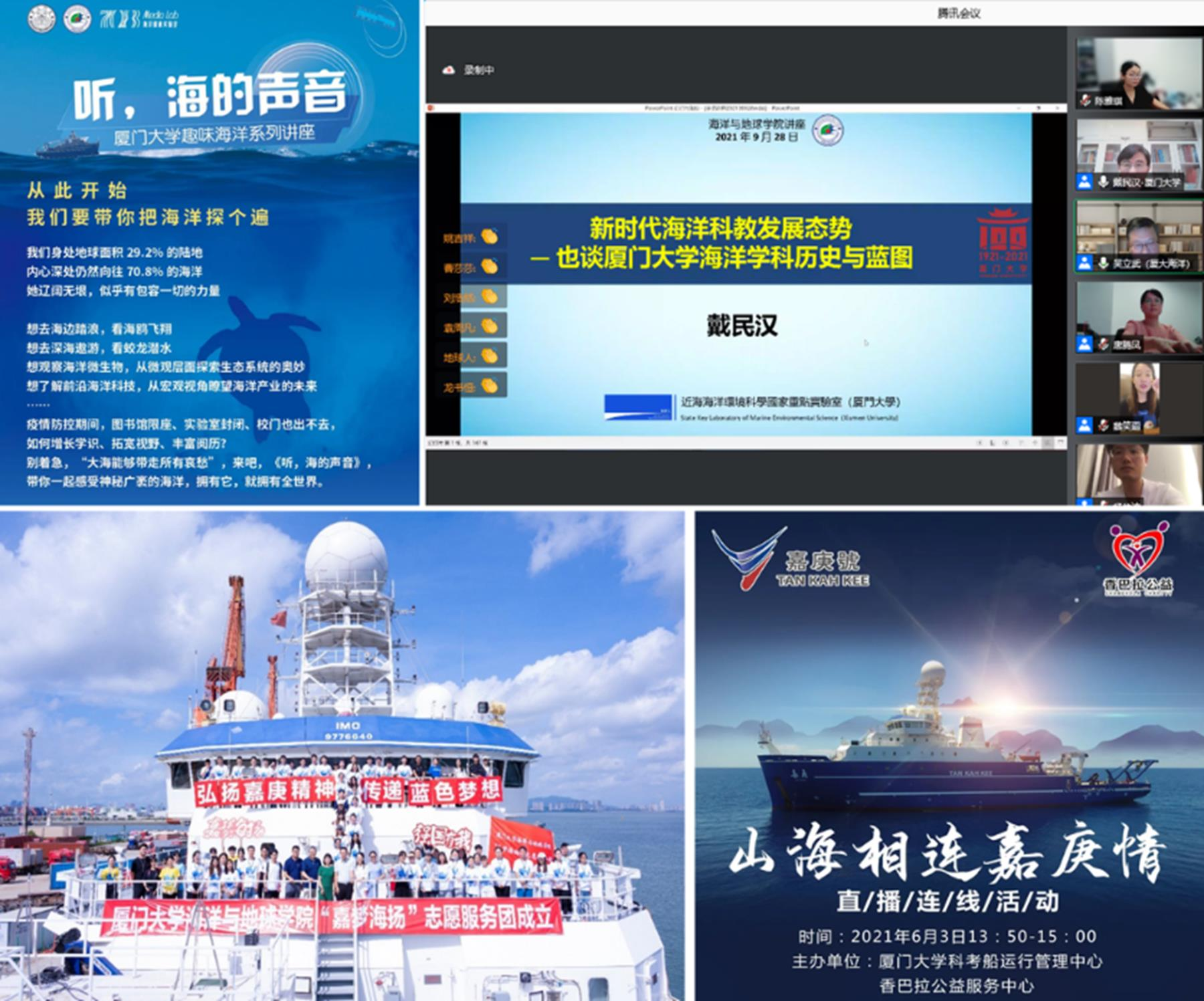 依托“嘉庚”号科考船,开展“山海相连嘉庚情”直播连线活动,带领云南省大山深处的孩子体验海洋探索之旅,将海洋科普送进山里;成立了“嘉梦海扬”志愿服务团,走进沙美公益图书馆,为孩子们吹响知识的“小螺号”,带去“大海”的声音,将弘扬嘉庚精神和践行海洋强国“蓝色梦想”有机结合,引导广大海洋学子做嘉庚精神的传承者,做海洋文化的传播者,做蓝色梦想的传递者。