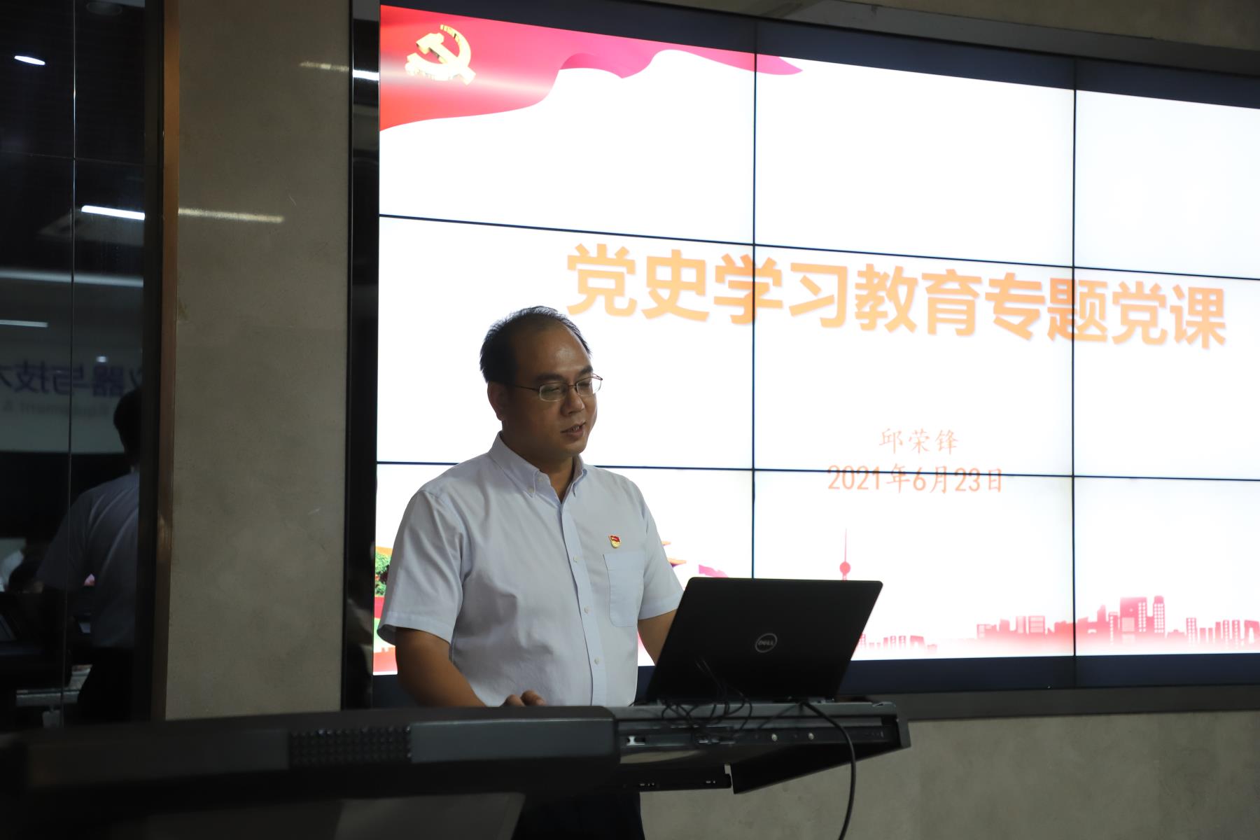 邱荣锋以微视频带领大家回顾了中国共产党成立百年来的重要事件。他指出,在中国共产党的领导下,党的面貌、国家的面貌、人民的面貌、军队的面貌、中华民族的面貌发生了前所未有的变化,中华民族迎来了从站起来、富起来到强起来的伟大飞跃。他从科学的理论指导、坚定的理想信念、强大的组织优势、坚实的群众基础、彻底的自我革命五个方面对“中国共产党为什么能”做了系统的阐述。