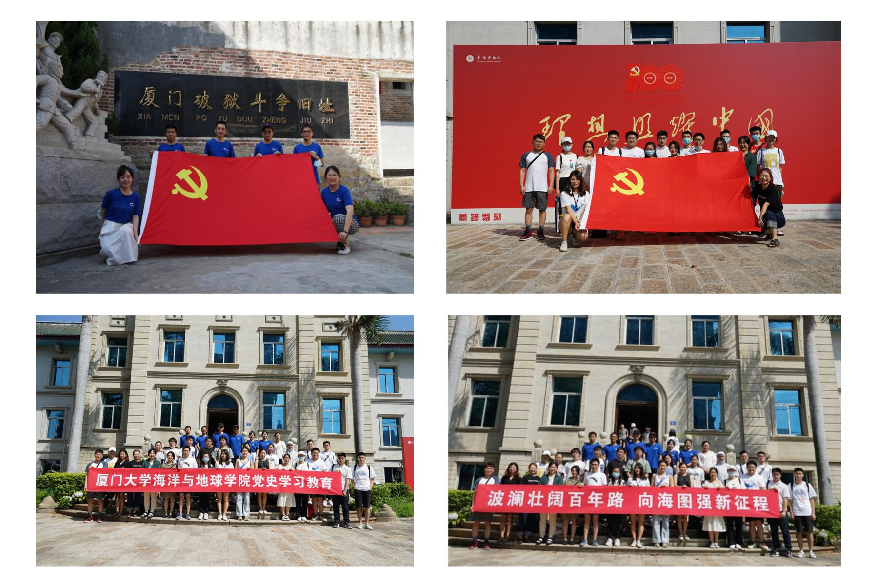 我院党委鼓励师生党支部共建,在研学实践中共学党史。应用海洋物理与工程系教工党支部、海洋物理研究生党支部、国重第三研究生党支部以“学党史 听党话 跟党走”为主题,联合开展“固定党日+”活动。30余名师生党员走进厦门市华侨博物院建党百年主题展、厦门破狱斗争旧址开展党史研学。师生党员在实践中共同学习中国共产党从无到有、应运而生的历史背景,感受中国共产党波澜壮阔的发展历程,领悟建党百年来熔铸锻炼出的一系列伟大精神,在珍贵史料中重温党的历史,接受精神的洗礼。