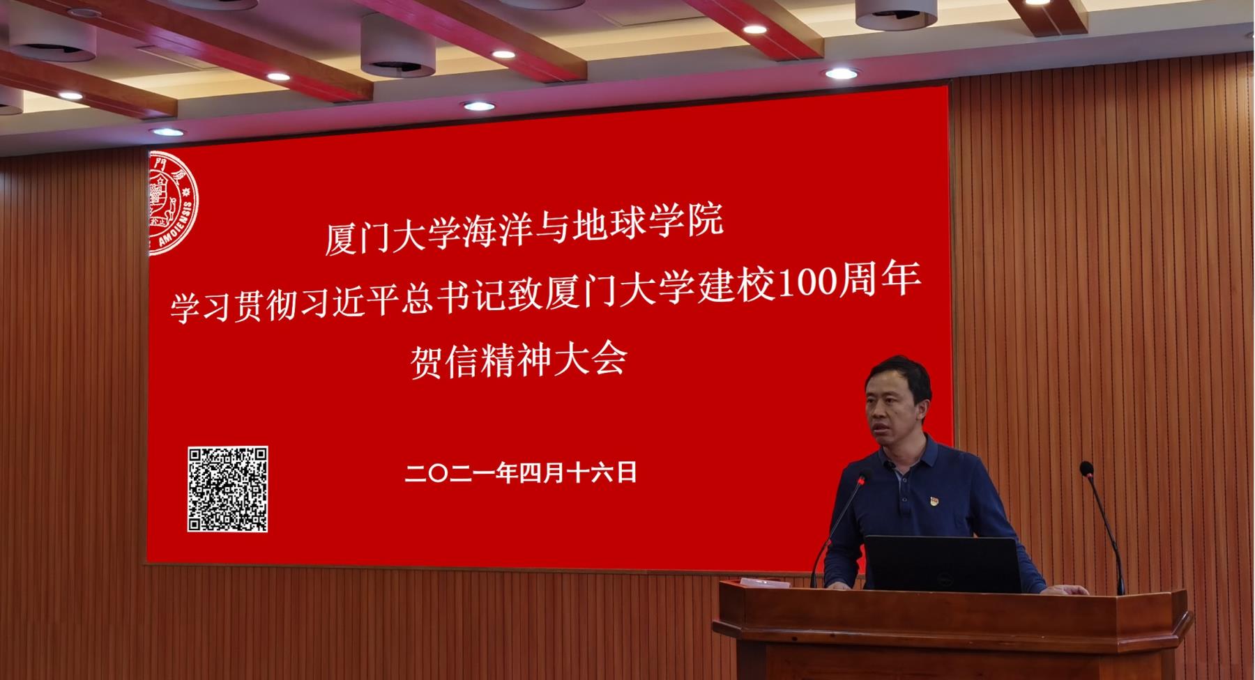 4月16日中午,海洋与地球学院召开学习贯彻习近平总书记致厦门大学建校100周年贺信精神大会,对全面深入学习宣传贯彻贺信精神进行部署。学院处级领导干部、学院党委委员、学院纪委委员、学院各党支部委员、学院办公室主任、党务秘书、党委组织员、辅导员、师生党员代表、党外人士及群众代表参加会议。学院党委书记陈东军主持会议。