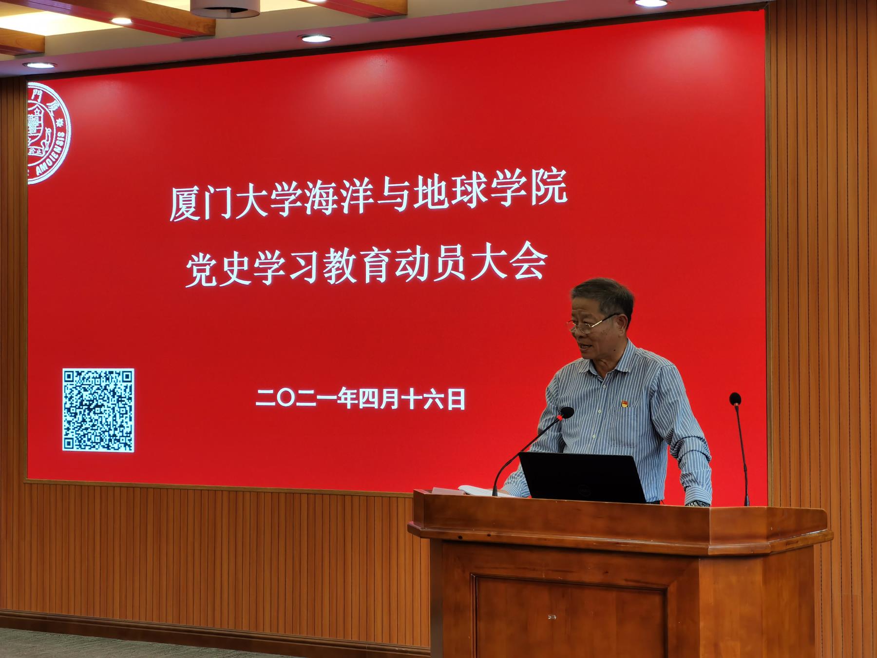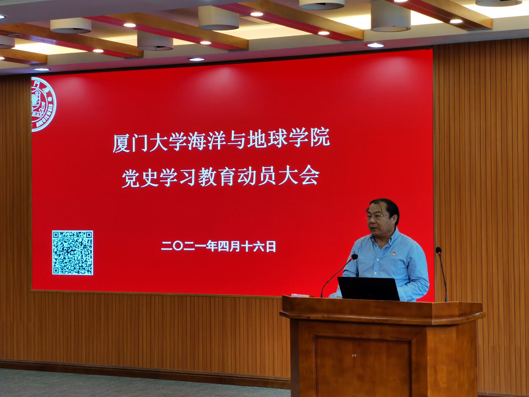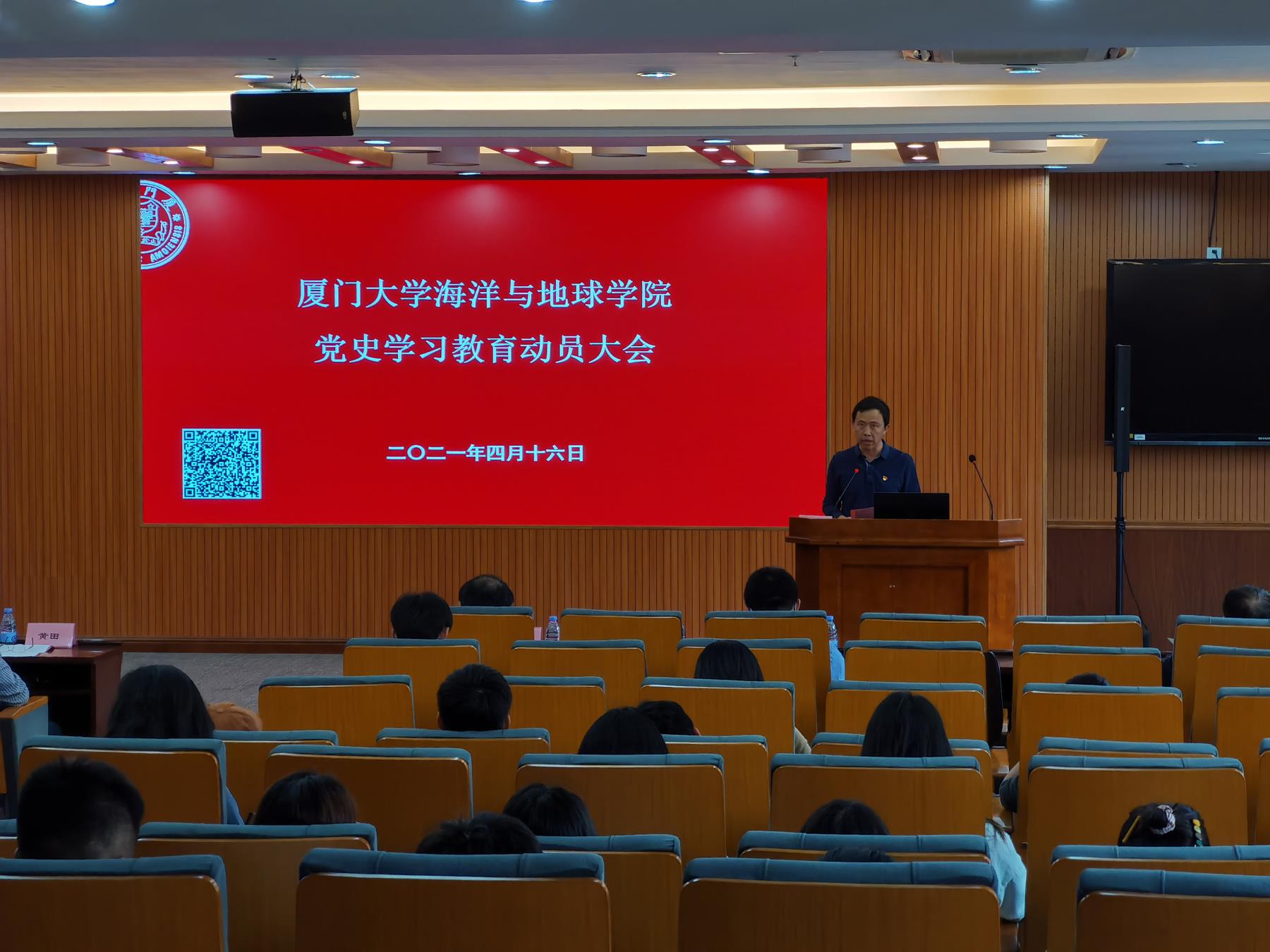 4月16日中午,海洋与地球学院召开党史学习教育动员大会,深入学习贯彻习近平总书记重要讲话精神,按照党中央的部署和校党委的工作要求,紧密结合学院工作实际,对学院开展党史学习教育进行动员部署。校党史学习教育第六指导组组长黄田,学院处级领导干部、学院党委委员、学院纪委委员、全院各党支部委员、学院办公室主任、辅导员、师生党员代表、党外人士及群众代表参加会议,会议由学院院长王克坚主持。