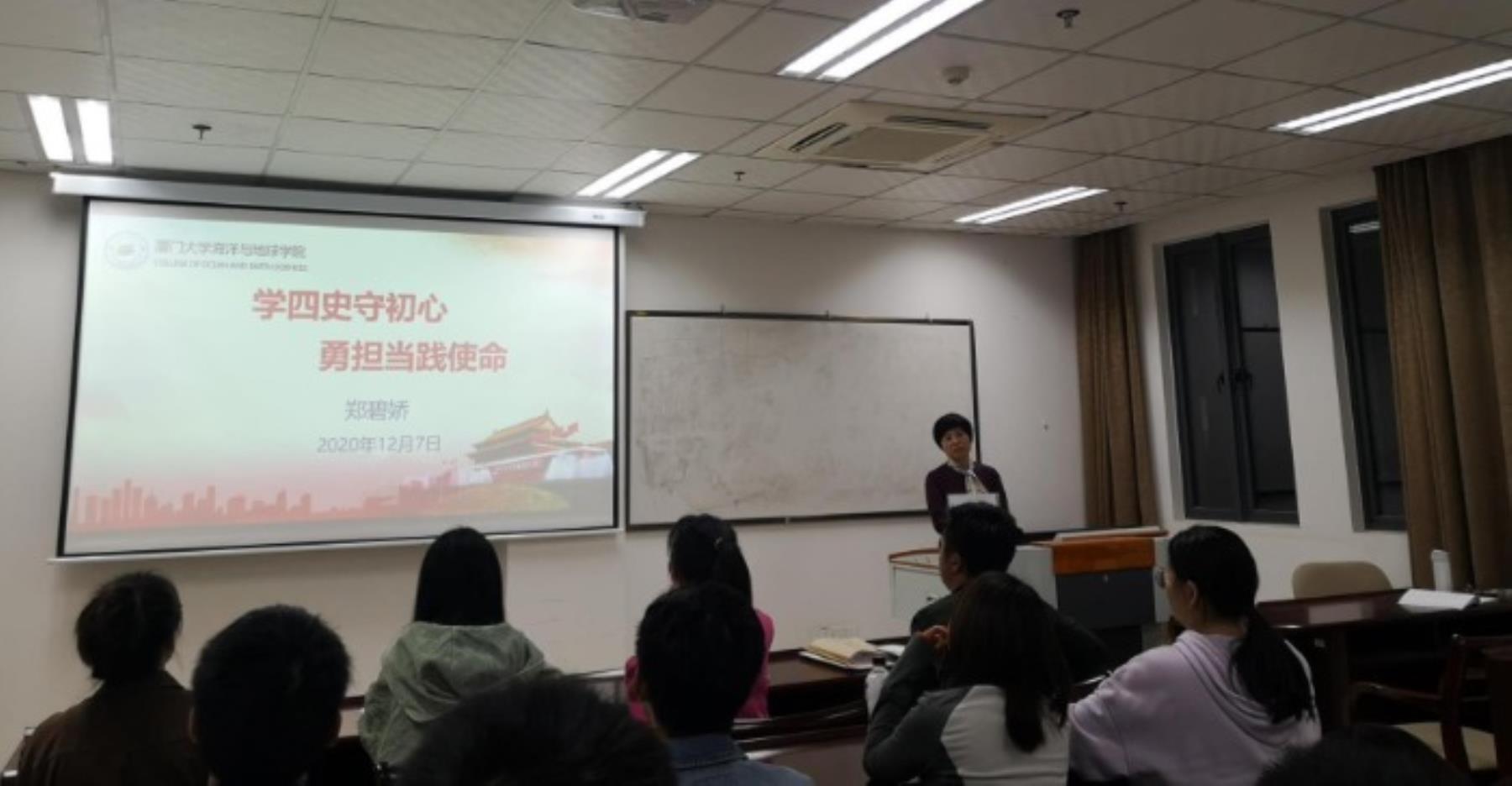 为推进“四史”学习教育,强化党委委员对所联系支部的指导,12月7日晚,海洋与地球学院党委副书记郑碧娇为物理海洋学行政班第一党支部讲授“学四史守初心、勇担当践使命”主题党课,物理海洋学行政班第一党支部副书记陈粮峰主持,支部全体成员参加学习。