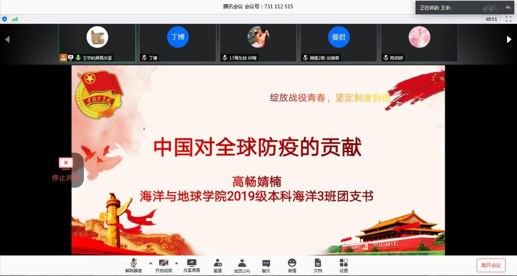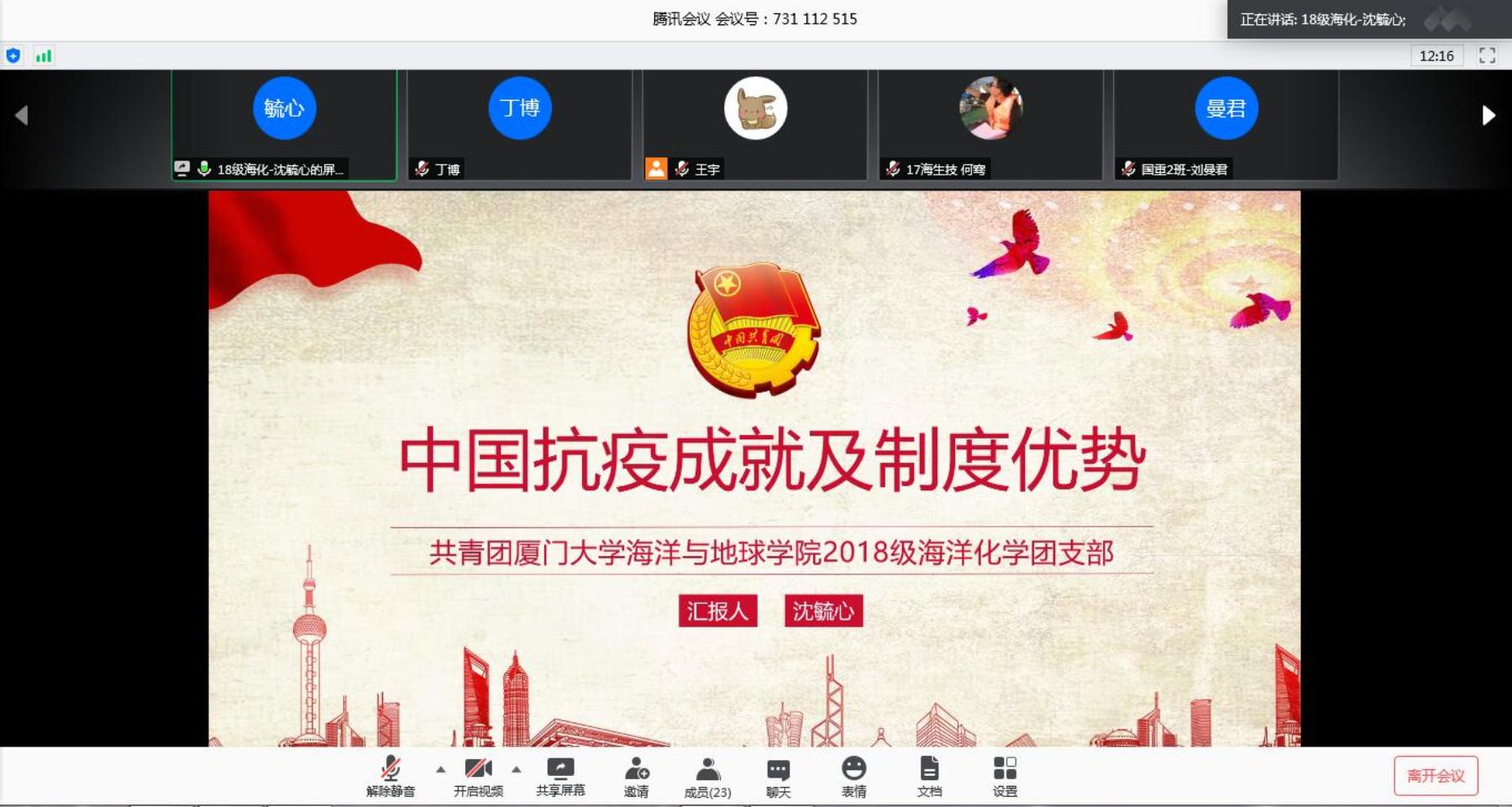 2018级本科海洋化学团支书沈毓心就中国的抗疫成就和制度优势进行了分享:“新冠肺炎疫情,是新中国成立以来发生的传播速度最快、感染范围最广、防控难度最大的一次重大突发公共卫生事件。面对来势汹汹的疫情,在以习近平同志为核心的党中央坚强领导下,中国采取最全面、最严格、最彻底的防控举措,14亿人民同舟共济,众志成城,同疫情展开顽强斗争,迅速控制了疫情形势。在全国上下共同努力下,中国疫情防控形势持续向好、生产生活秩序加快恢复的态势不断巩固和拓展。”“在制度优势方面……显示了特殊时期党和国家的监督保障制度在积极发挥作用,及时回应社会关切,依法办理相关案件,杜绝形式主义和官僚主义,保证党和人民赋予的权力能够始终用来为人民谋幸福。”