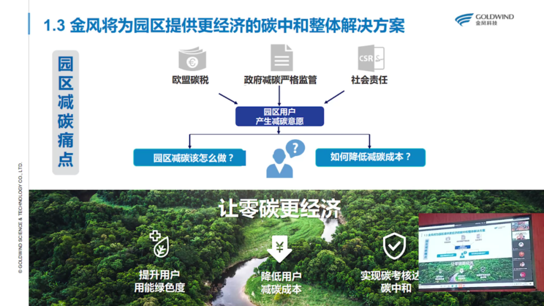 2021年11月21日,在联合国可持续发展目标SDGs 共创工作坊中,金风科技天润新能电力市场部创新业务主任刘昊博士向大家介绍了中国首个可再生能源“碳中和”智慧园区案例——金风科技亦庄智慧园区。该园区集可再生能源、智能微网、智慧水务、绿色农业和运动健康等功能于一体的可感知、可思考、可执行的绿色园区生态系统,为企业履行“碳”责任、探索可持续发展的“碳中和”之路提供了路径参考。