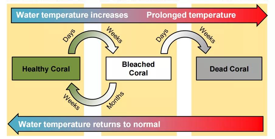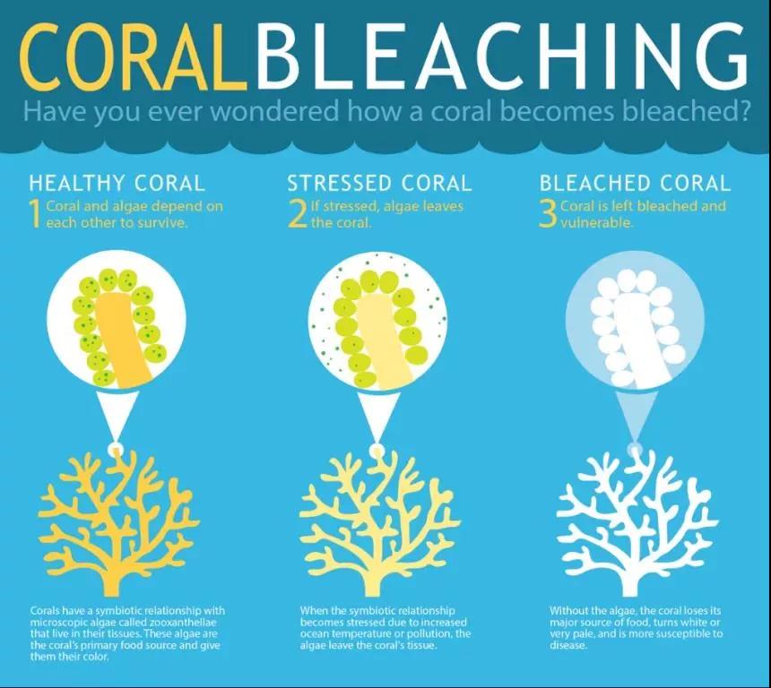 一旦珊瑚受到了来自外界环境温度、光照、营养物质等条件的压力时,便开始变得亚健康,他们会处于应激状态下,开始排斥自身组织中与自己朝夕相处的共生藻类,露出自已白色的骨骼。