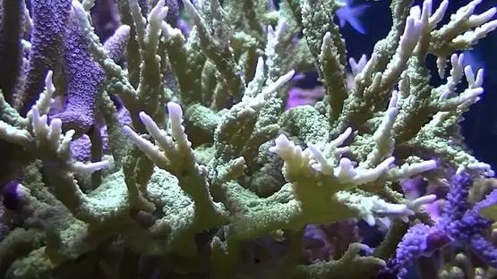 细枝鹿角珊瑚,为分枝形珊瑚的一种,分枝通常以奶黄色或棕色为主,分枝末端是非常特别的亮蓝色或者紫色,从珊瑚骨架图来看,其分枝多而细长,“大长腿”的称号并不为过。然而,拥有“大长腿”有时也并非好事,在风海浪来临时,细枝珊瑚往往首当其冲,最容易被大片折断。