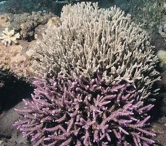 这张在印度尼西亚珊瑚礁拍摄的照片,乍一看,除了颜色区别以外似乎应该是同一种珊瑚。而事实上,灰白色的为斑星蔷薇珊瑚,而下面紫色的珊瑚其实是鹿角珊瑚。若非仔细观察,似乎很难区分。