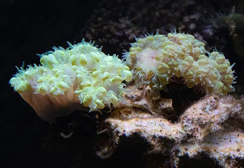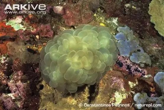 如果你以为硬珊瑚就只有这些“硬汉”,那你就错了。这些看上去软乎乎的,像是一串串葡萄,又像是一触即破的气泡的泡囊珊瑚竟然也属于硬珊瑚。泡囊珊瑚,便是一种看起来形似软珊瑚,实则不能造礁的硬珊瑚。白天,泡囊珊瑚会吹起泡泡,晶莹剔透。但到了晚上,它们便会伸出一只只触手,捕食海水中的各种浮游生物。