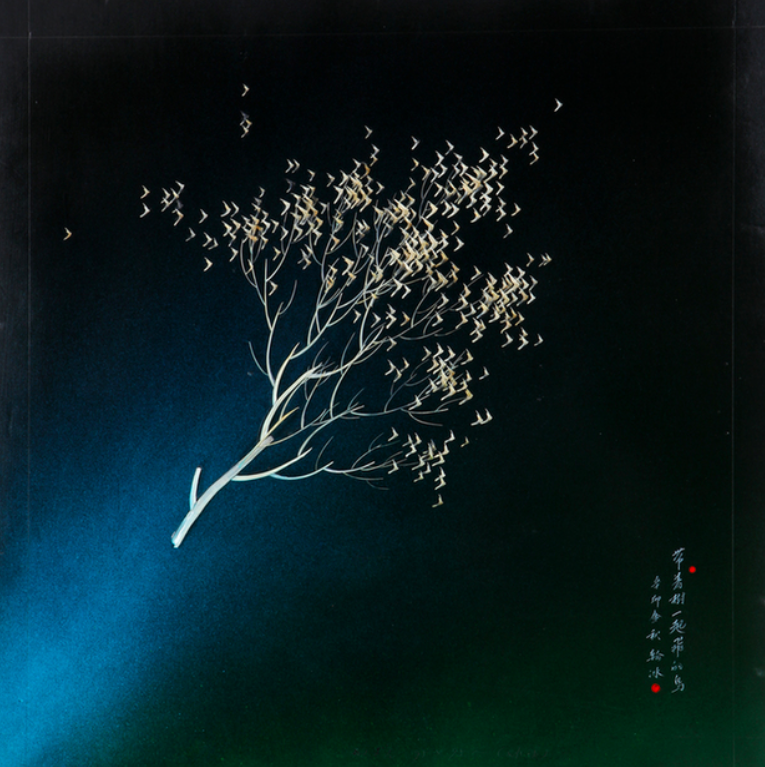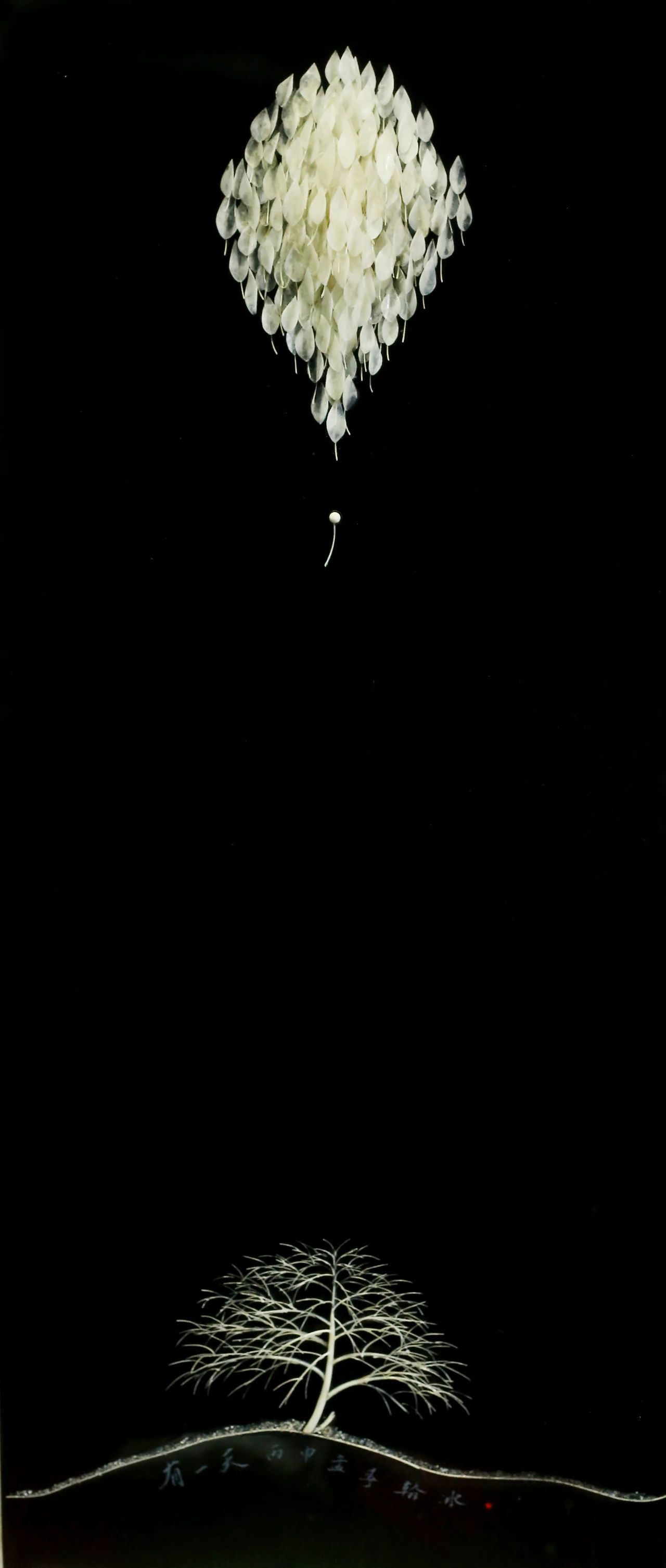 作品中的小鸟选自鱼鳃骨两边的骨头。近看是小鸟,远看像树叶。我们知道,现在环境污染很严峻,小鸟的生活状态是越来越艰难。这幅作品表达作者对当下环境污染,特别是大气污染的一种谴责。
