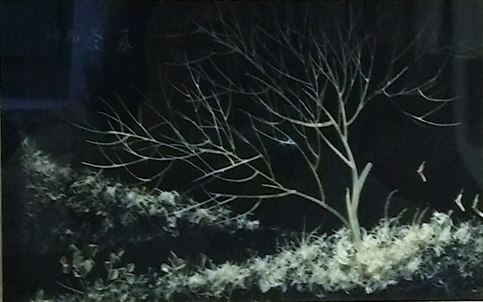 这幅作品的材料用的是一种澳洲鱼鳞。用白底黑质的鱼鳞,来表现夏夜黑漆漆的森林中,恐惧而神秘的氛围,而鱼鳞下面的鱼骨就像在树叶下穿梭的蛇,也像是蚯蚓和虫子在黑夜里窸窸窣窣的穿行。