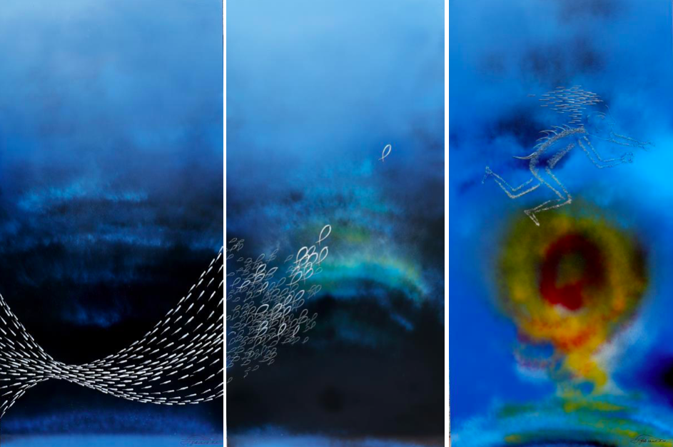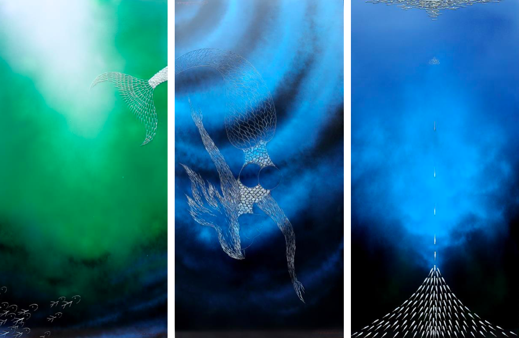 该系列6幅作品,主要讲述蓝色大海里的生灵演变进化的过程,和海洋美丽的传说。远古人类也是从海洋中演变而来。不管我们的故事有多么精彩,最终都要回归自然。