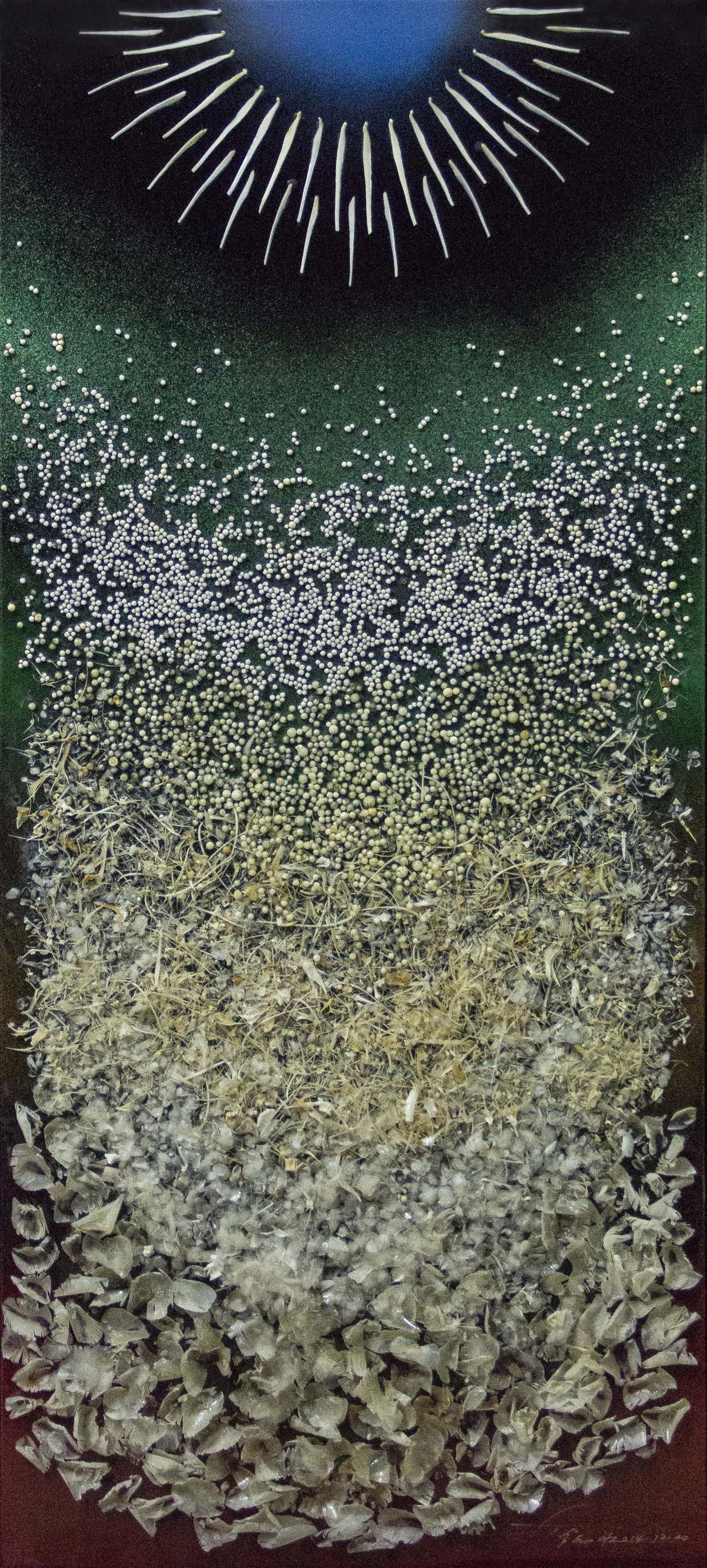 这幅作品希望呈现出春天百花竞放、芬芳馥郁的景象。采用的是深海鱼的鱼鳞进行创作,这种鱼鳞质如白玉,形似花瓣,能够非常好的展现出花海绽放的景象。
