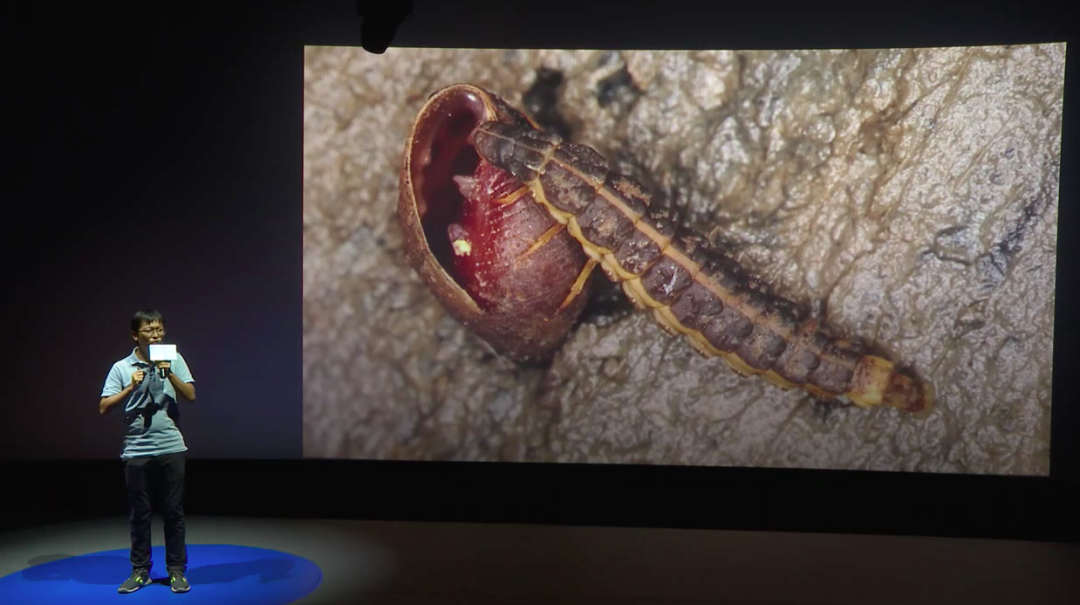 前面看到我们把木头打开找到了船蛆,但船蛆为什么叫贝类呢?因为它的最前面有两片贝壳,合起来呈一个半圆形,最前面有很多分立的像刀片一样的结构。我们现在挖隧道用的盾构机,它的刀片的原理就是和船蛆学习的。学习船蛆怎么样在木头里面不断的钻洞,一边钻一边把木屑吃掉。