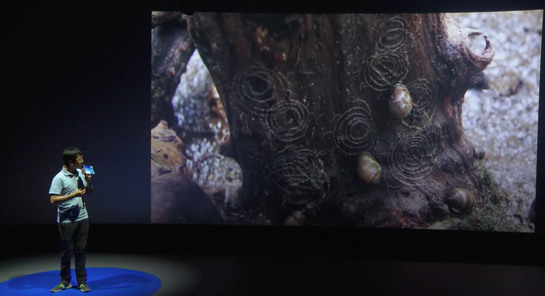 后来我发现它的旁边有长得像斗笠一样的生物,我们可以简单称它为笠螺,斗笠的笠。它们产卵的时候,就画圈圈产卵。圈圈里面有成千上万的卵,这是很有意思的。