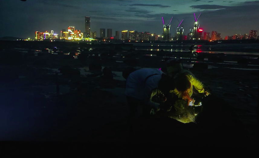 讲到夜晚,我们就要来讲一讲,其实潮间带的生物跟陆地上生物一样,有很多是在夜里活动比较活跃的,所以我们在做潮间带生物的研究和观察的很多时候都是选择夜间。我们叫做夜间观察。这是在厦门环岛路的观音山海滩。