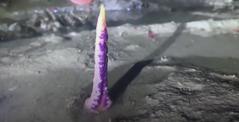 在厦门的海边,走着走着发现滩涂上有一个像蜡烛一样东西,尝试戳一戳,缩进去了这也是一种海腮,沙箸一类的。等到海水漫过来的时候,它的中间柄旁边那些(结构)就像羽毛一样就竖起来了,看起来像一根羽毛笔一样特别的漂亮。